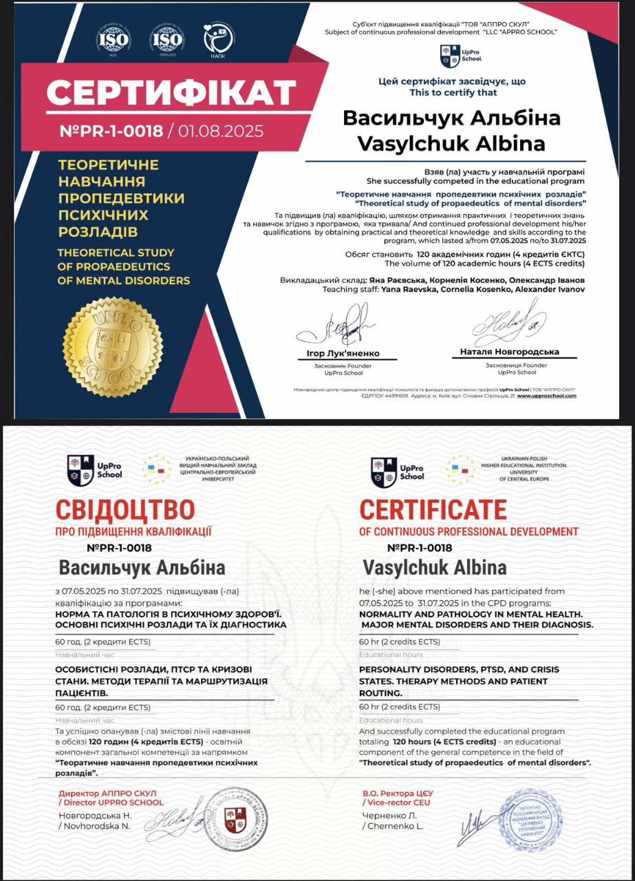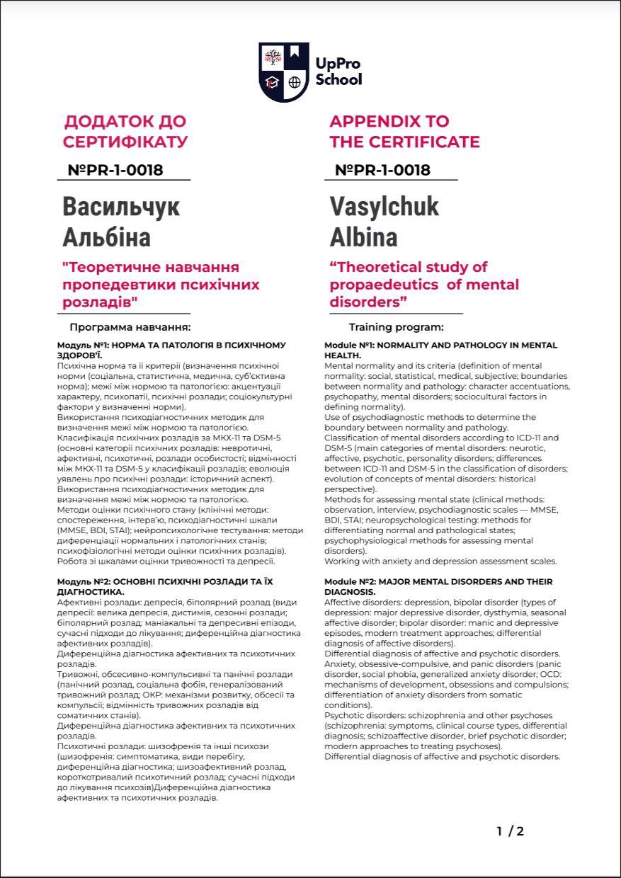 2025 — Програма підвищення кваліфікації «Теоретичне навчання пропедевтики психічних розладів» (Норма та патологія в психічному здоров’ї. Основні психічні розлади та їх діагностика. Особистісні розлади, ПТСР та кризові стани), UpPro School.