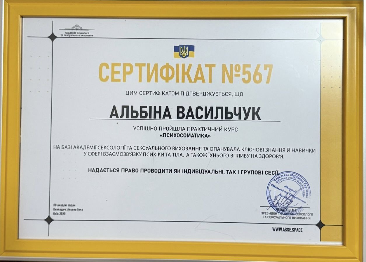 2025 — Курс «Психосоматика» на базі Академії сексології та сексуального виховання, Надання права проводити індивідуальні та групові сесії в сфері взаємозв’язку психіки та тіла, впливу на здоров’я