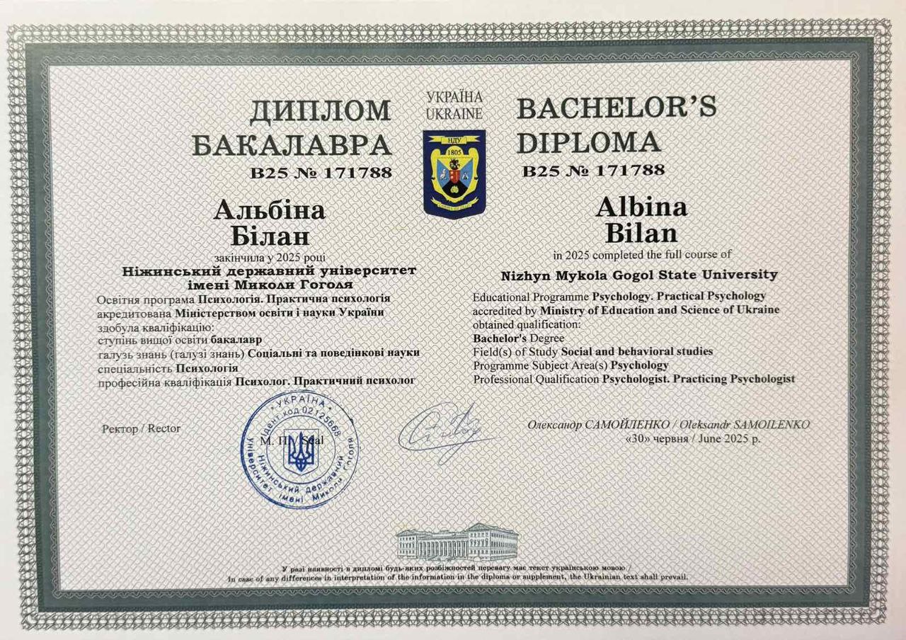 2025 — Бакалавр психології, спеціальність «Психологія», професійна кваліфікація — психолог, практичний психолог, Ніжинський державний університет імені Миколи Гоголя