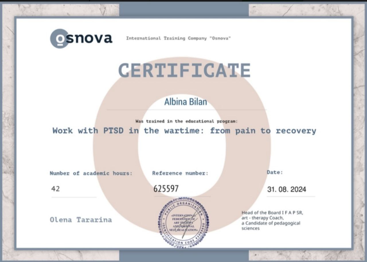 2024 — Програма «Work with PTSD in the wartime: from pain to recovery», Міжнародна тренінгова компанія «Osnova».
