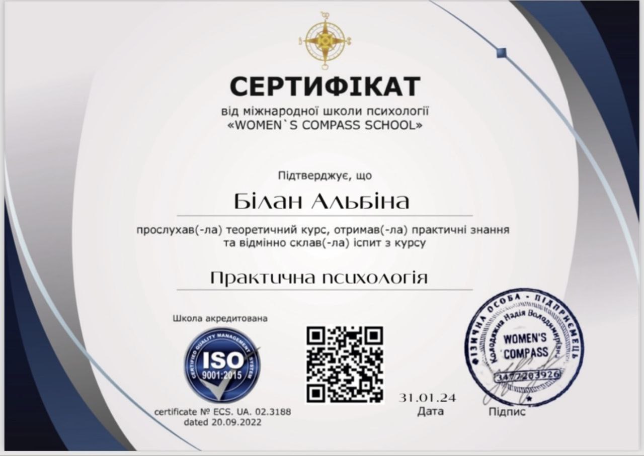 2024 — Курс «Практична психологія», Міжнародна школа психології «Women’s Compass School»