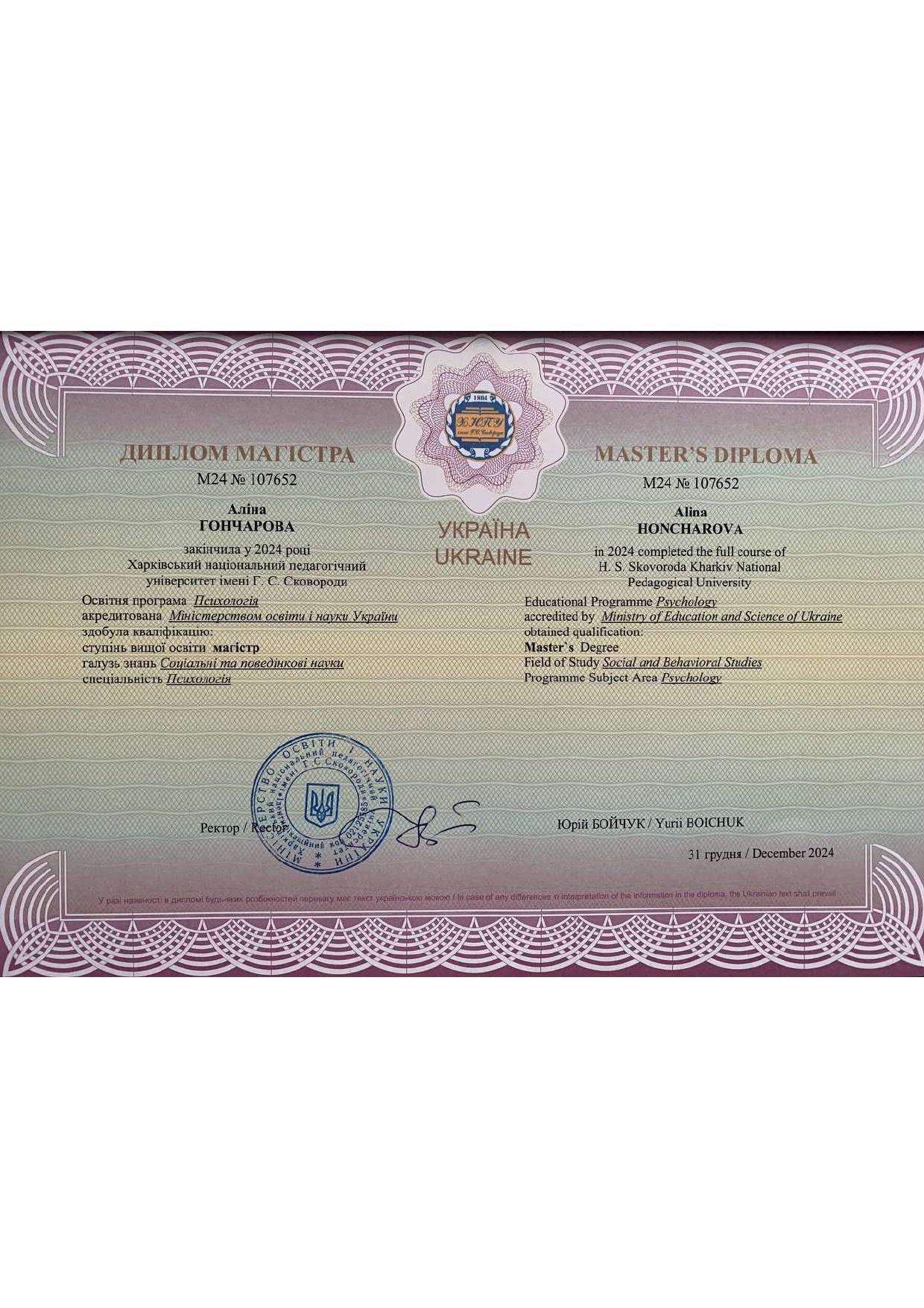 2024 — ХНПУ ім.Г.С.Сковороди за спеціальністю “Психологія 053”.