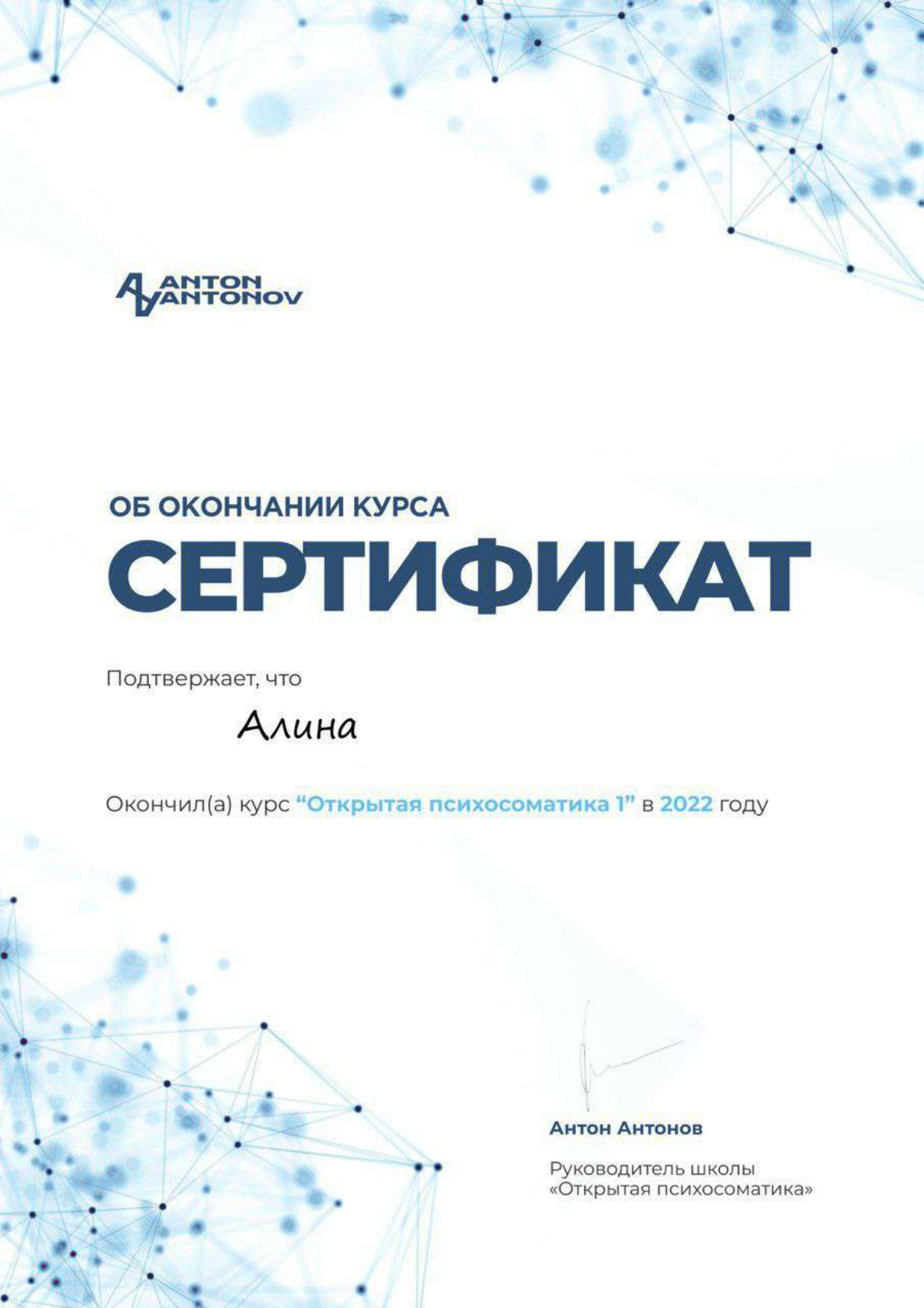 Я маю вищу психологічну освіту з темою диплома про методи арт-терапії, які застосовувала на практиці у роботі з дітьми та дорослими. Також навчалася методу “Психосоматика 1.0”, “Психосоматика 2.0”.
