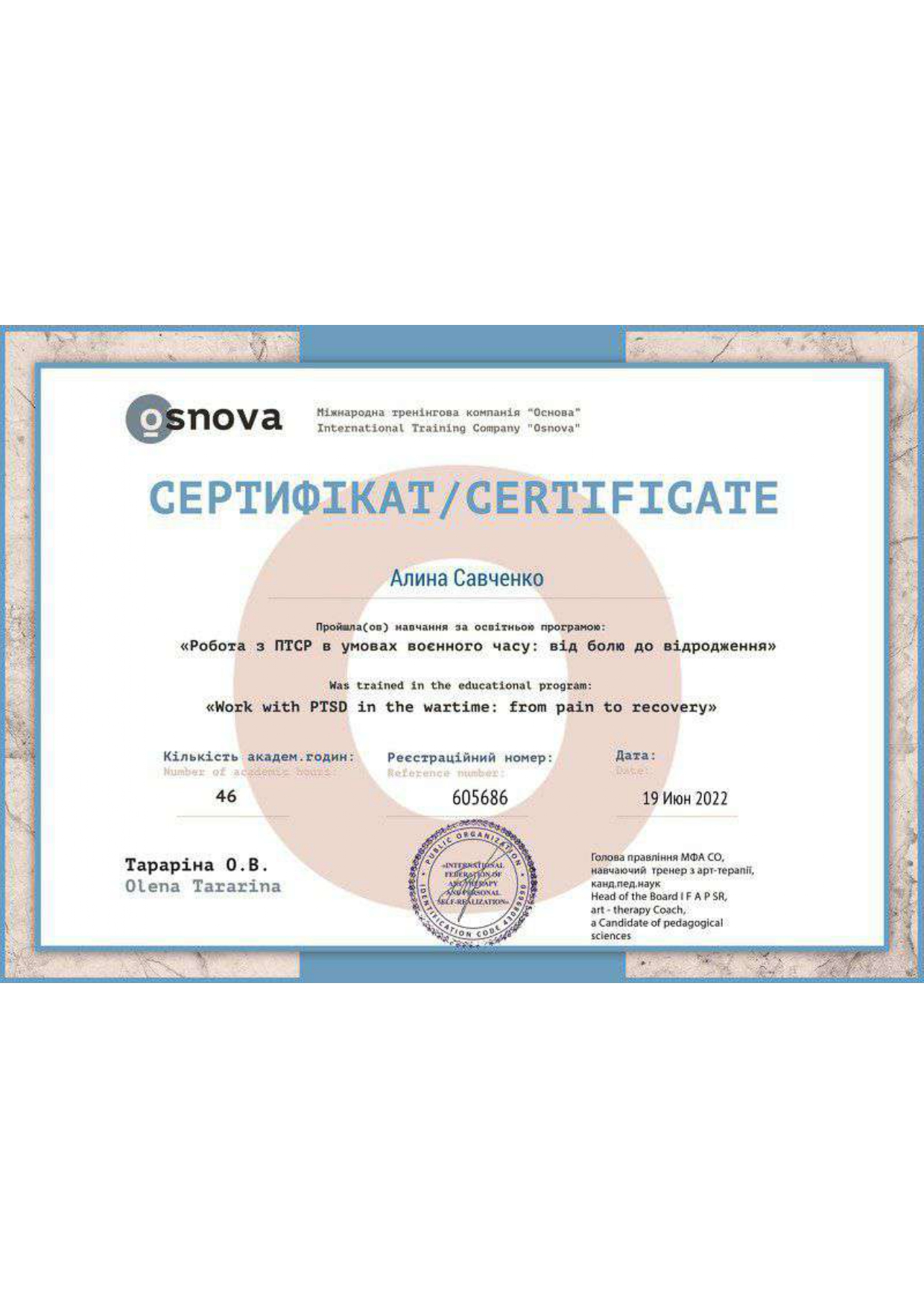 Проходила навчання та практику з курсу “Робота з ПТСР в умовах воєнного часу”, маю досвід проведення групових психологічних сесій для жінок та дівчат у рамках благодійних організацій.