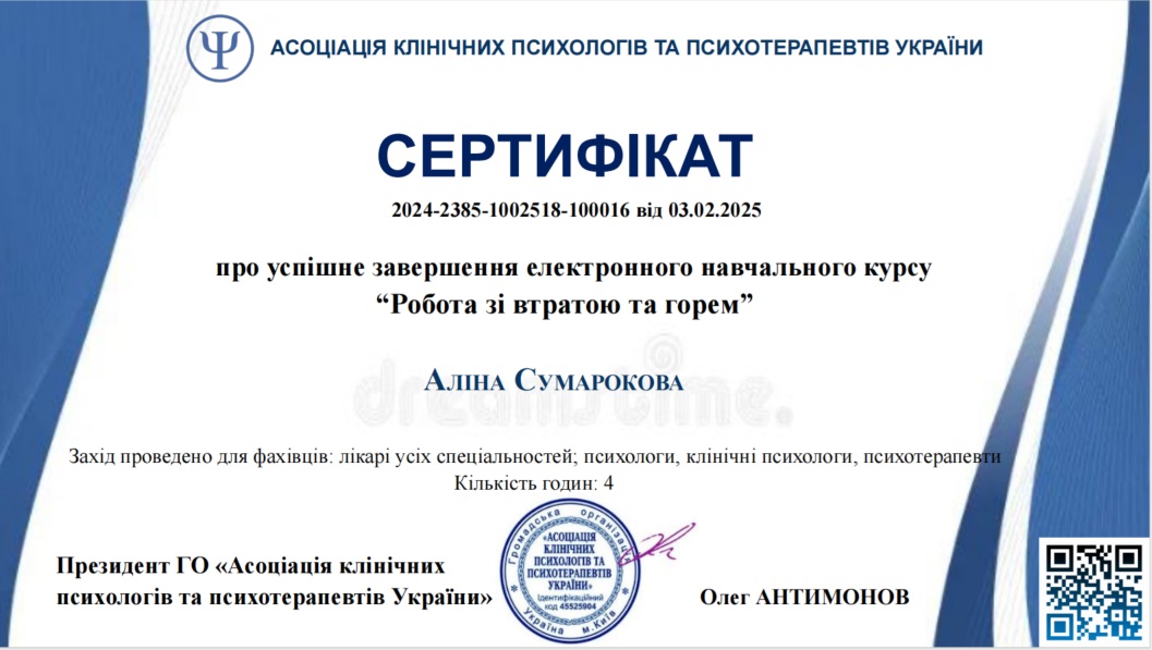 2025 — Електронний курс «Робота з втратою та горем», Асоціація клінічних психологів та психотерапевтів України