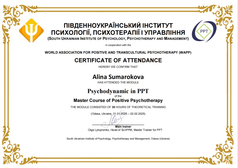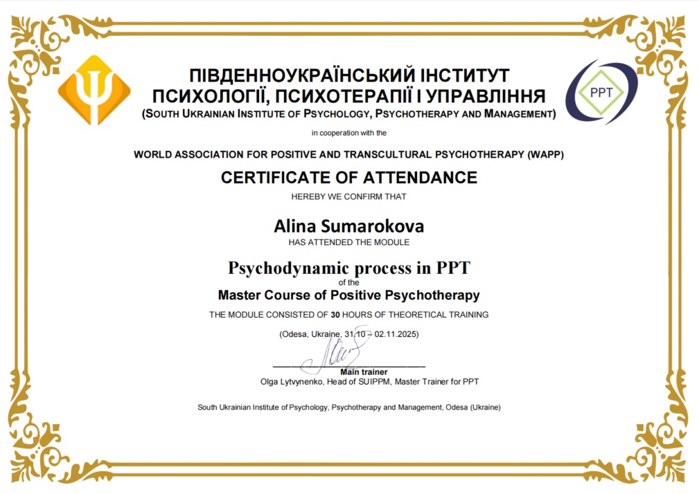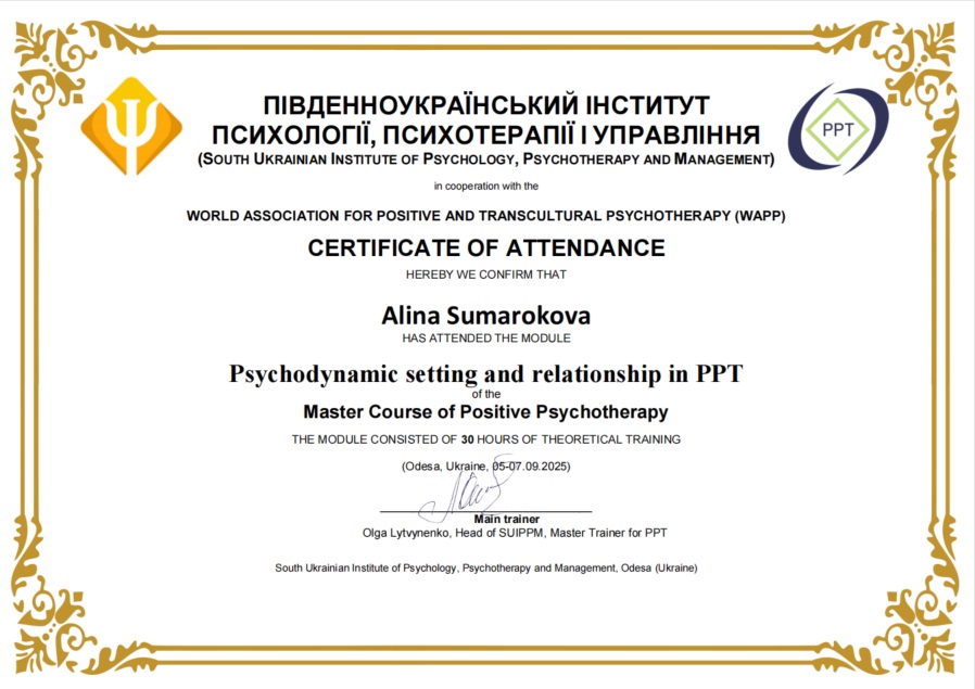 2025 — Модуль «Psychodynamic in PPT» (психодинамічний процес у позитивній психотерапії) Південноукраїнський інститут психології, психотерапії та управління (SUIPPM), в співпраці з World Association for Positive and Transcultural Psychotherapy (WAPP)