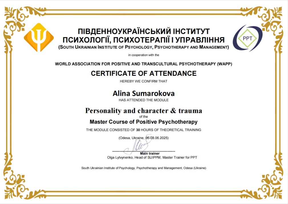 2025 — Модуль «Personality and character & trauma» (особистість, характер та травма в позитивній психотерапії), Південноукраїнський інститут психології, психотерапії та управління (SUIPPM), в співпраці з World Association for Positive and Transcultural Psychotherapy (WAPP)
