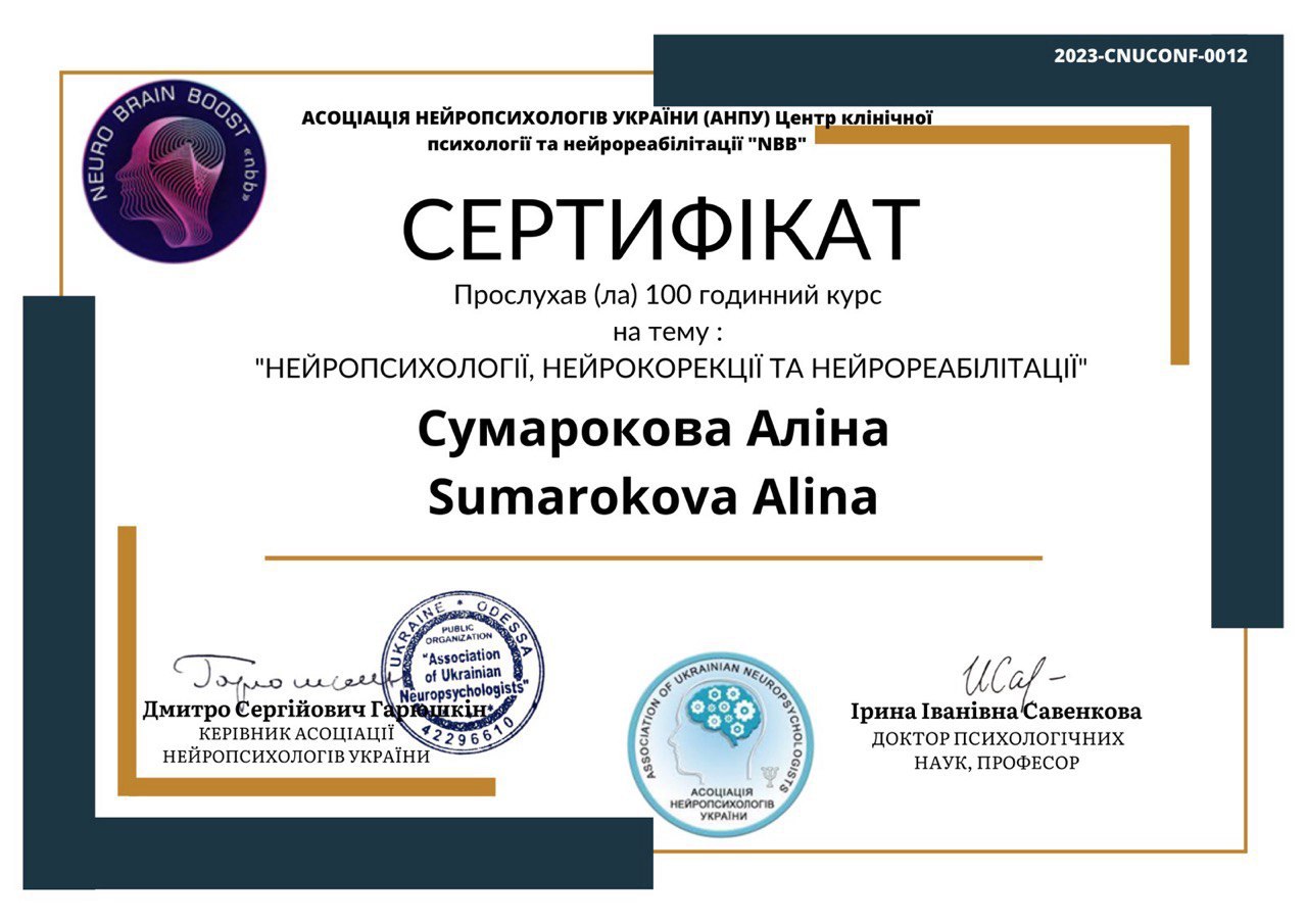 2023 — Курс «Нейропсихологія, нейрокорекція та нейрореабілітація», Асоціація нейропсихологів України (АНПУ), Центр клінічної психології та нейрореабілітації «NBB»