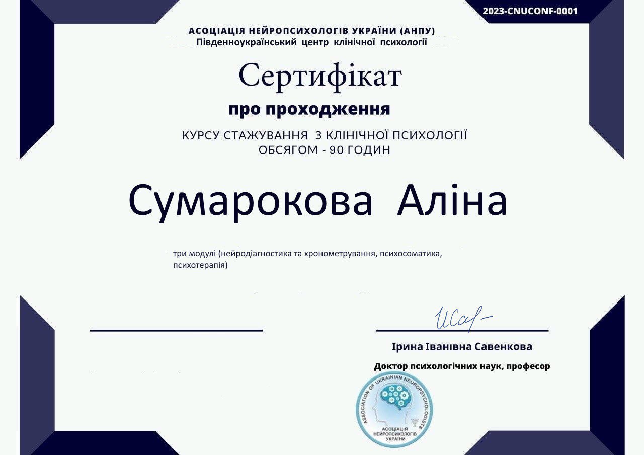 2023 — Курс стажування з клінічної психології (три модулі: нейродіагностика та хронометрування, психосоматика, психотерапія) Асоціація нейропсихологів України (АНПУ), Південноукраїнський центр клінічної психології