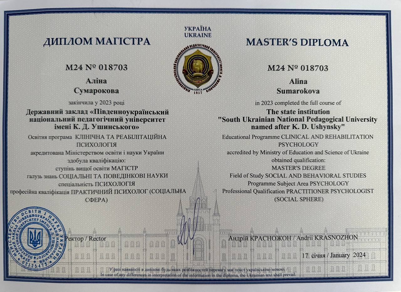 2024 — Магістр психології (професійна кваліфікація«Практичний психолог (соціальна сфера)», ОП “Клінічна та реабілітаційна психологія), Державний заклад «Південноукраїнський національний педагогічний університет імені К. Д. Ушинського»
