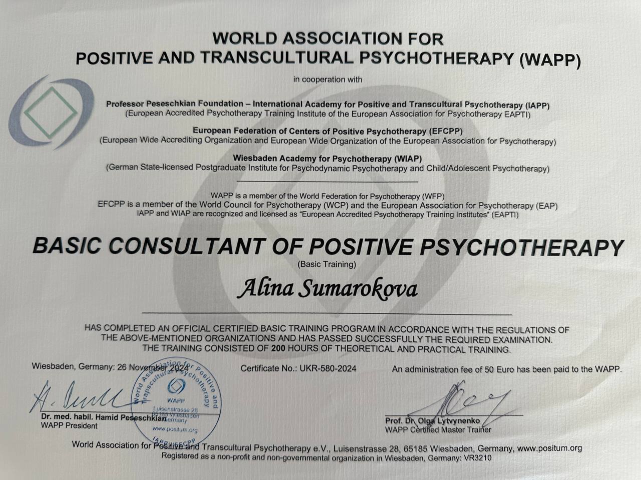2024 — Basic Consultant of Positive Psychotherapy (базовий курс позитивної психотерапії + іспит), World Association for Positive and Transcultural Psychotherapy (WAPP), Wiesbaden Academy for Psychotherapy (WIAP), International Academy for Positive and Transcultural Psychotherapy (IAPP), в співпраці з European Federation of Centers of Positive Psychotherapy (EFCPP)