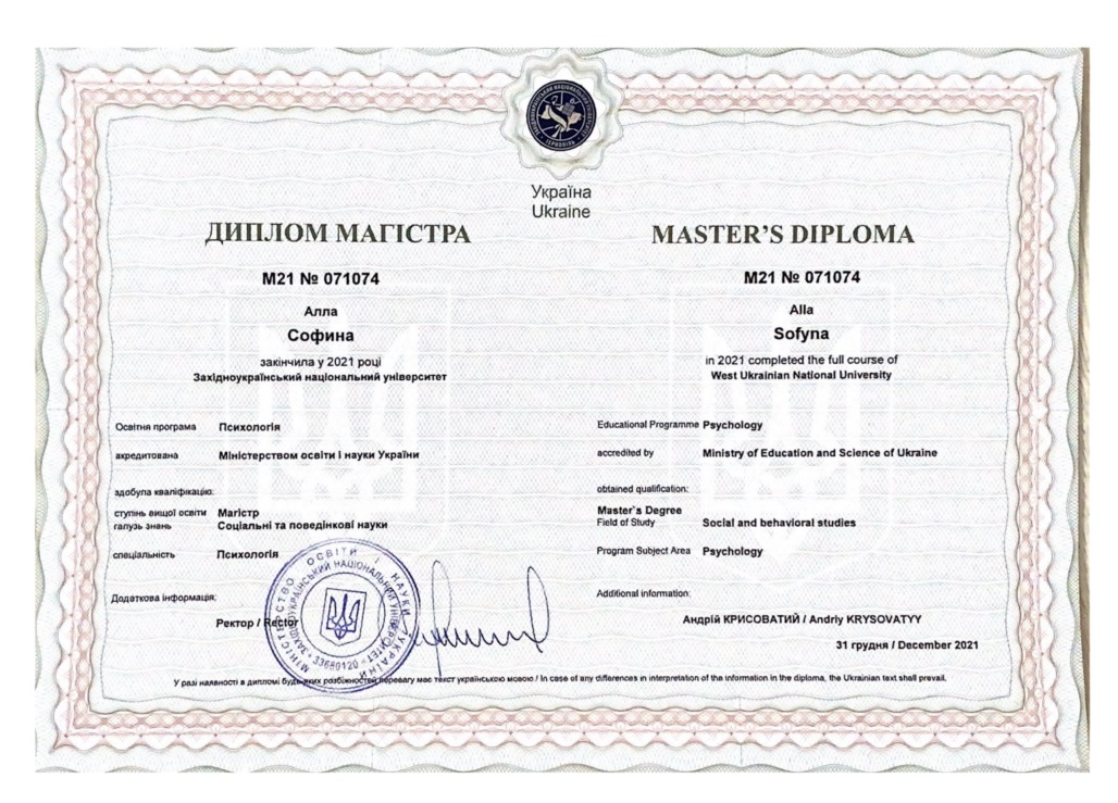 2021 — Магістр психології, спеціальність «Психологія», Західноукраїнський національний університет