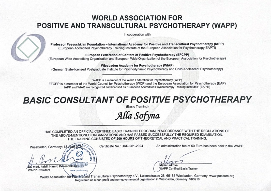 2024 — Базовий курс позитивної психотерапії (Basic Consultant of Positive Psychotherapy), World Association for Positive and Transcultural Psychotherapy (WAPP) — 200 годин теоретичної та практичної підготовки