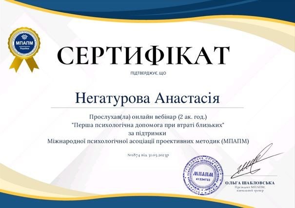 2023 — «Перша психологічна допомога при втраті близьких», Міжнародна психологічна асоціація проективних методик (МПАПМ)