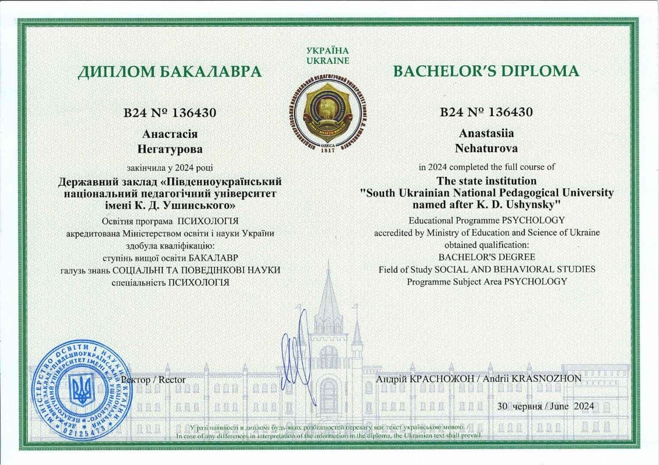 2024 — Бакалавр психології, Державний заклад «Південноукраїнський національний педагогічний університет імені К. Д. Ушинського»