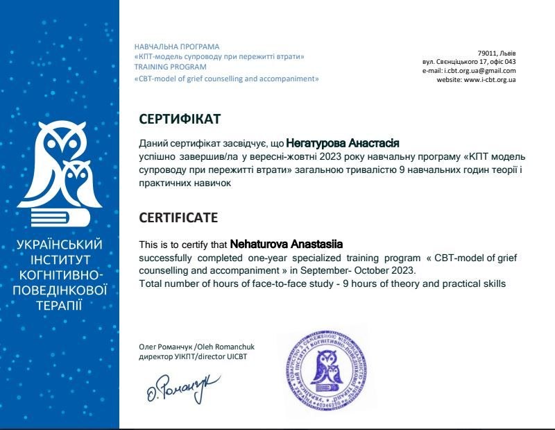 2023 — «КПТ-модель супроводу при переживанні втрати», Український інститут когнітивно-поведінкової терапії