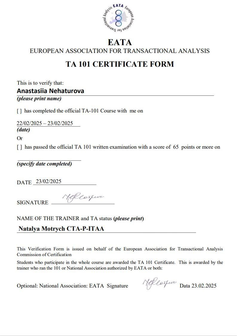 2025 — «TA 101 (курс транзактного аналізу)», European Association for Transactional Analysis (EATA)