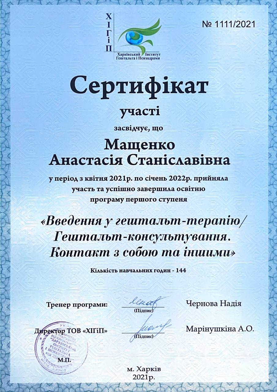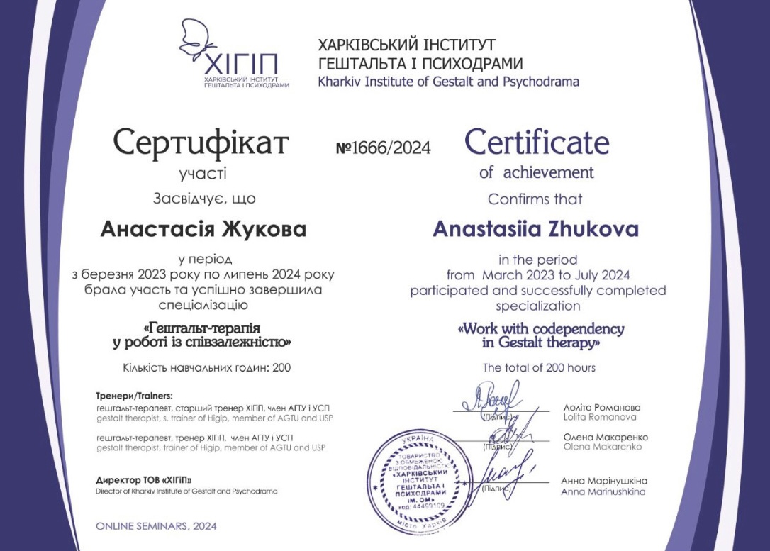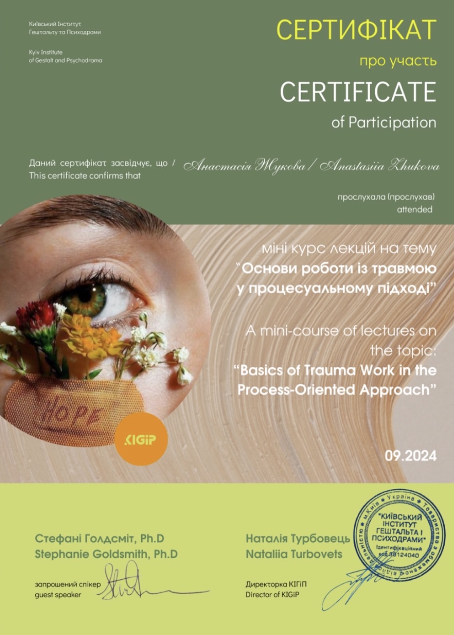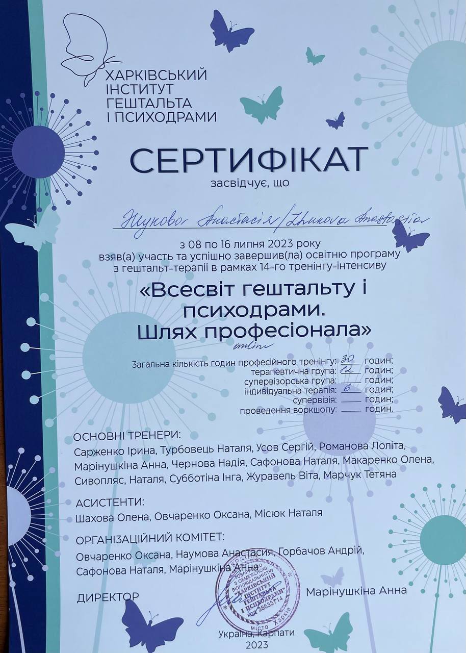 Гештальт-терапевт (з 2021 року – сертифікація в 2026 році) — Харківський інститут гештальту і психодрами.