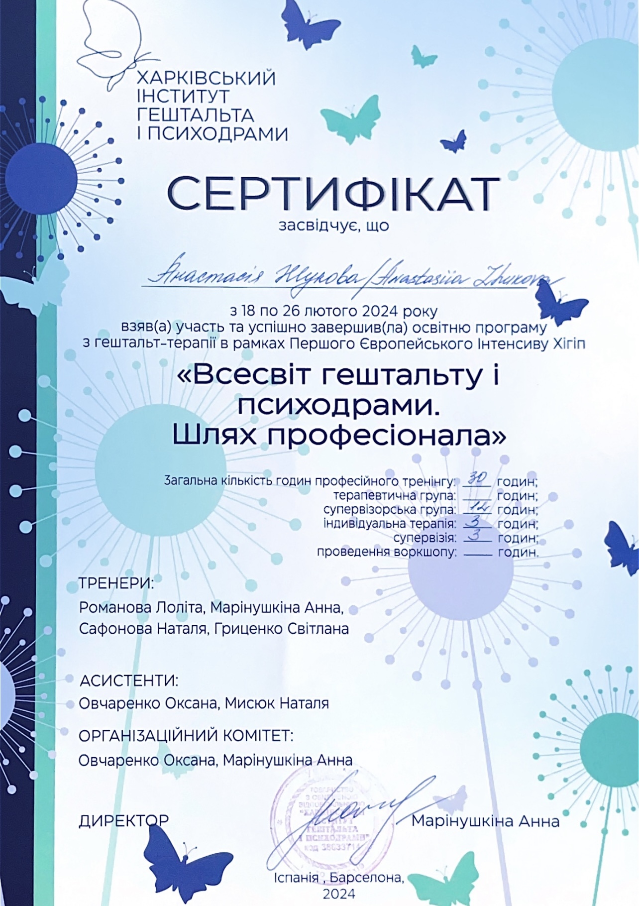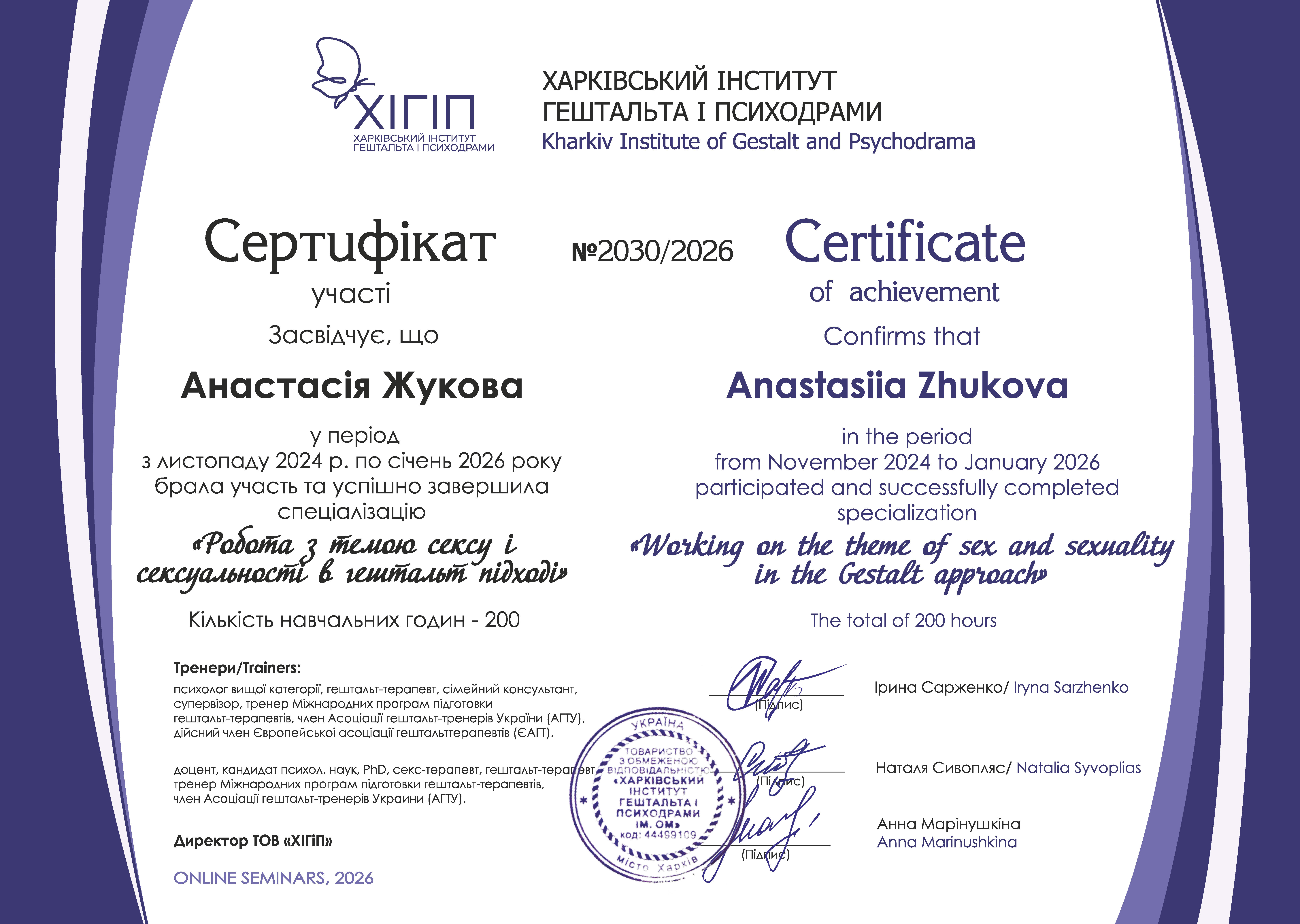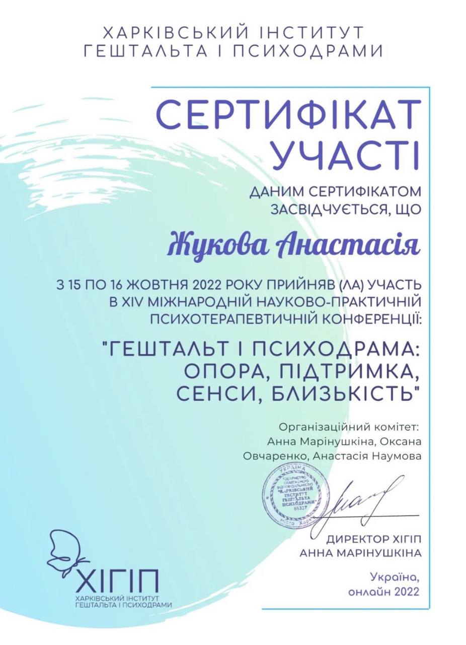 Гештальт-терапевт (з 2021 року – сертифікація в 2026 році) — Харківський інститут гештальту і психодрами.