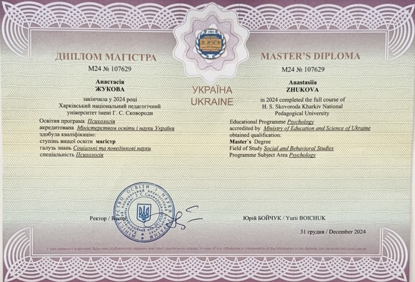 Магістр психології — Харківський національний педагогічний університет імені Г. С. Сковороди.