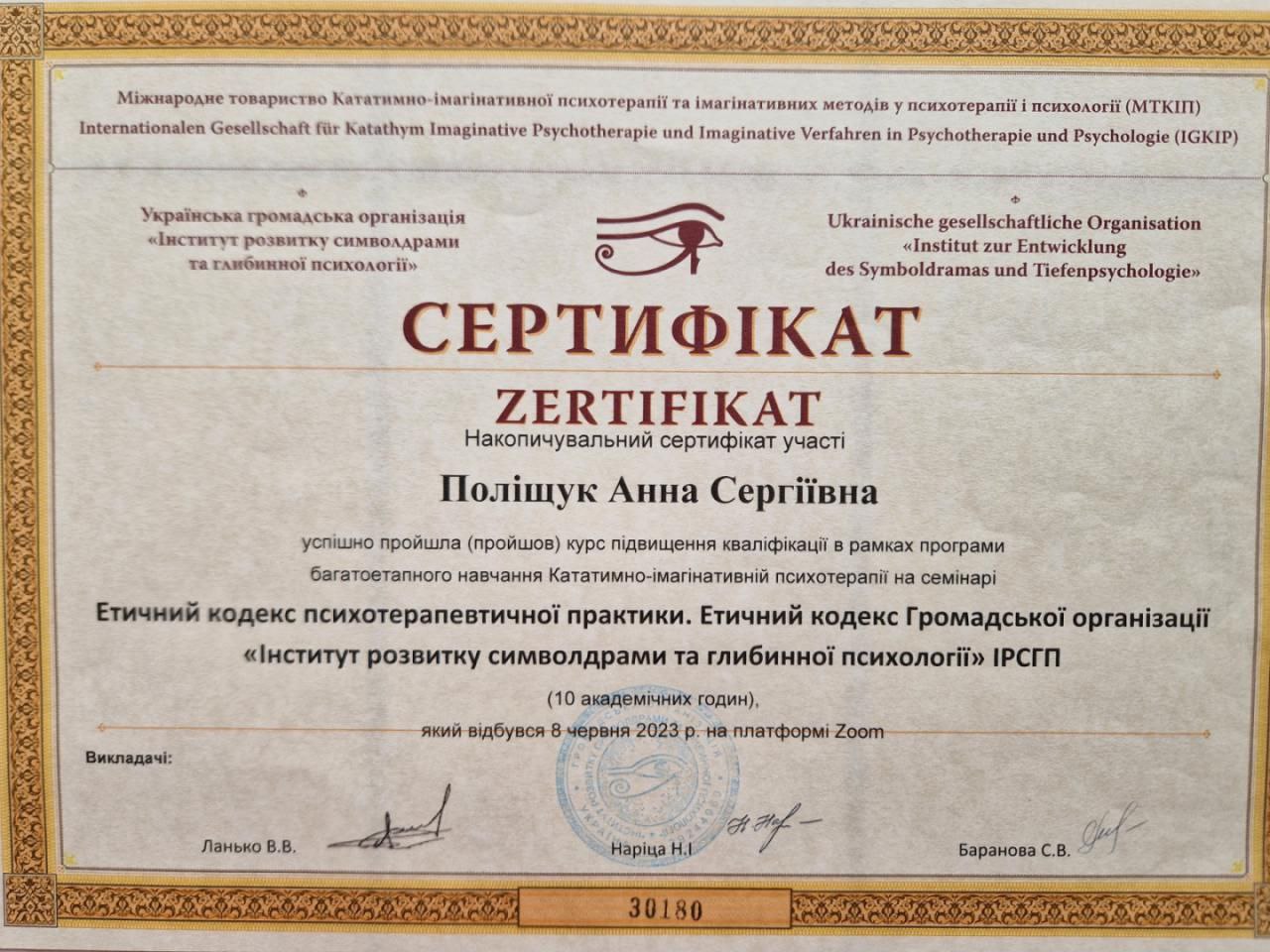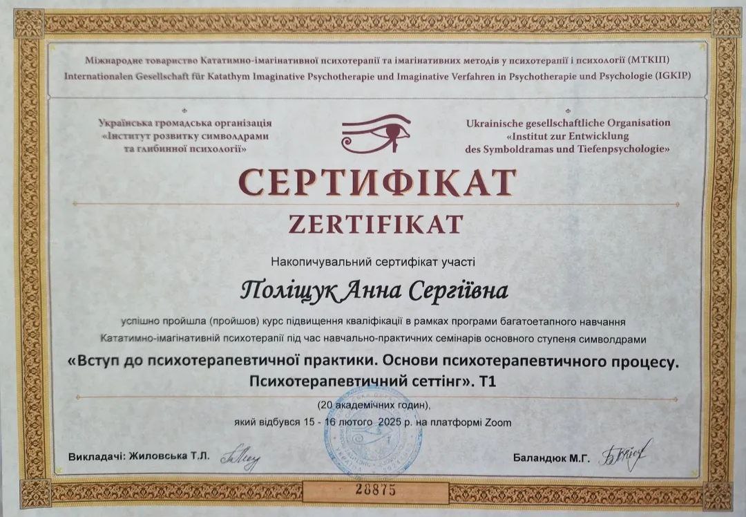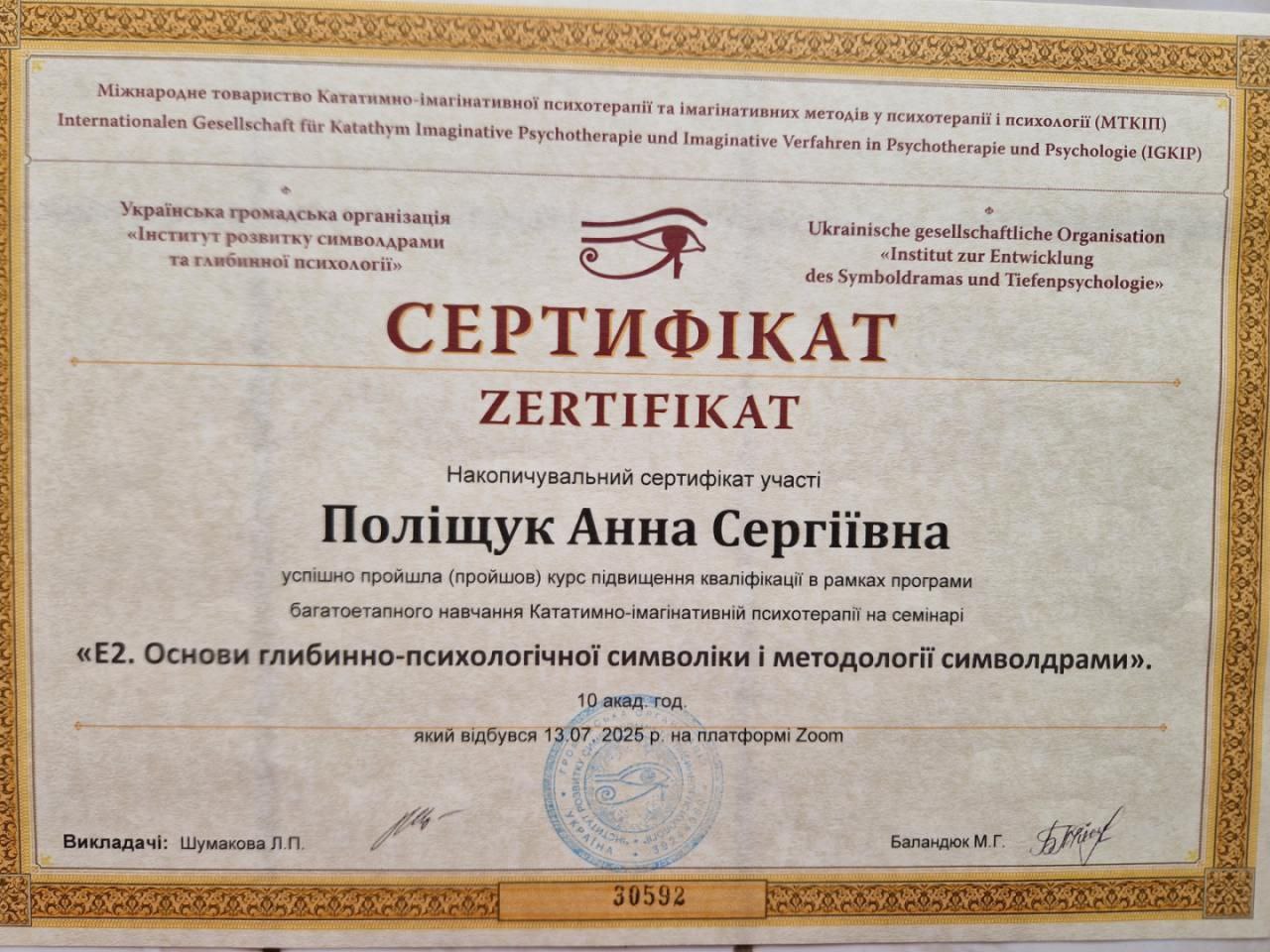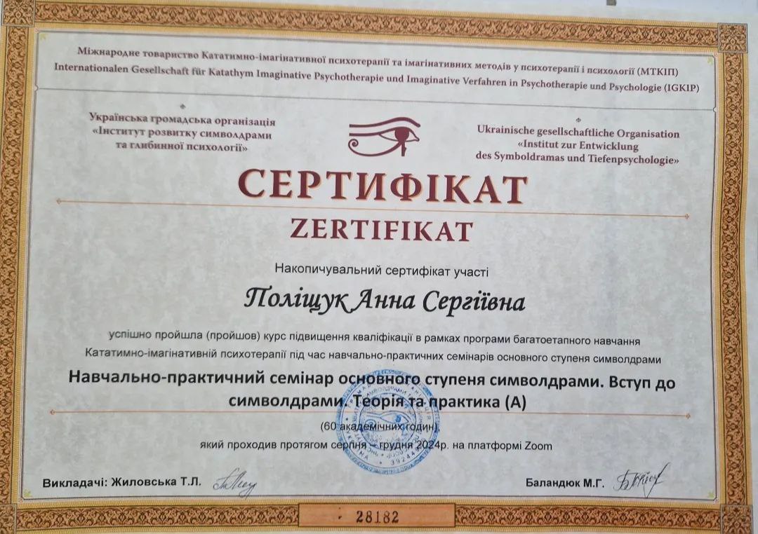 2024 -донині — Інститут розвитку символдрами та глибинної психології (ІРСГП) навчаюсь на консультанта: