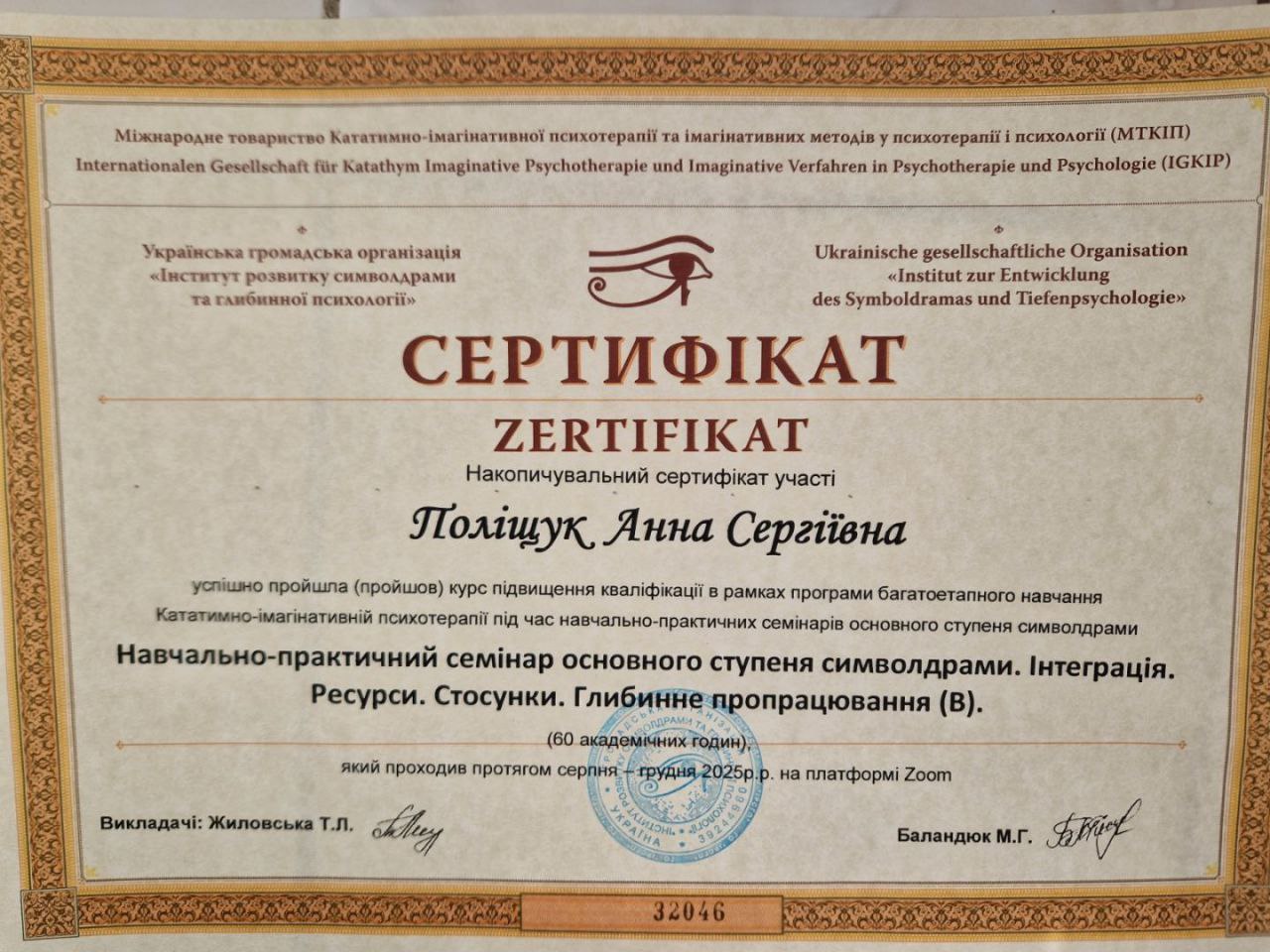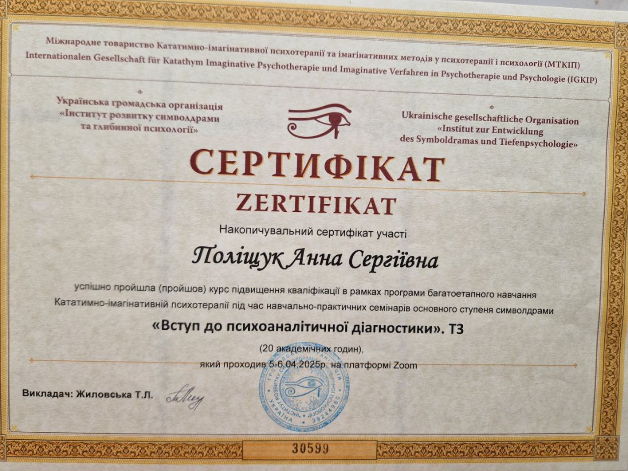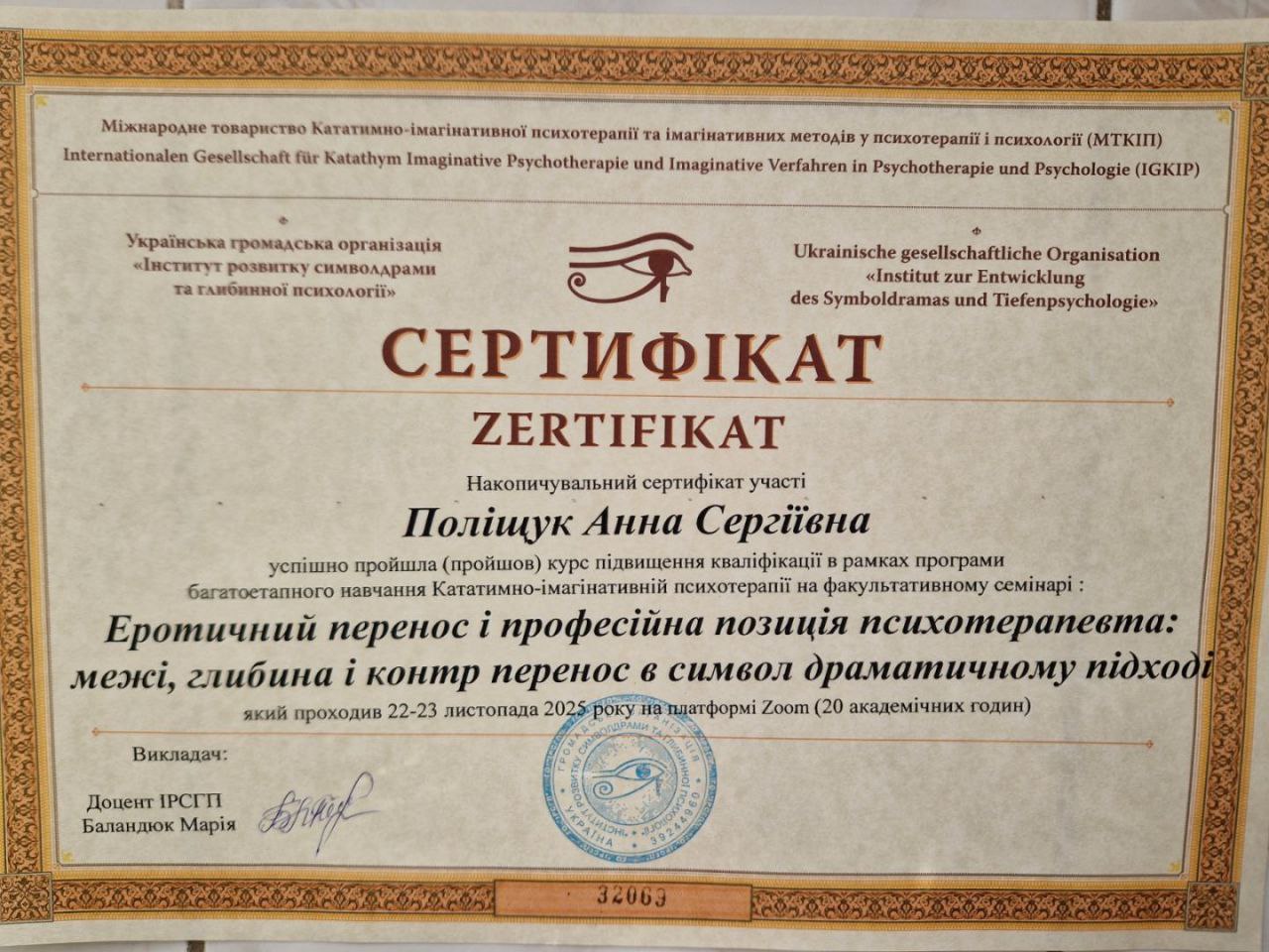 2024 -донині — Інститут розвитку символдрами та глибинної психології (ІРСГП) навчаюсь на консультанта: