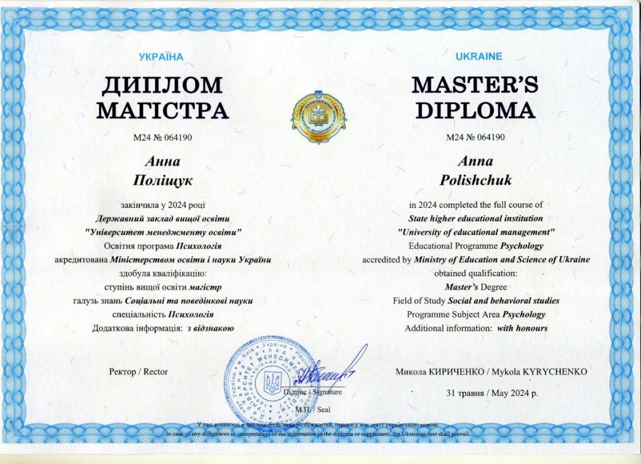 2024 — Магістр психології (диплом з відзнакою), спеціальність Психологія, ДЗВО «Університет менеджменту освіти».