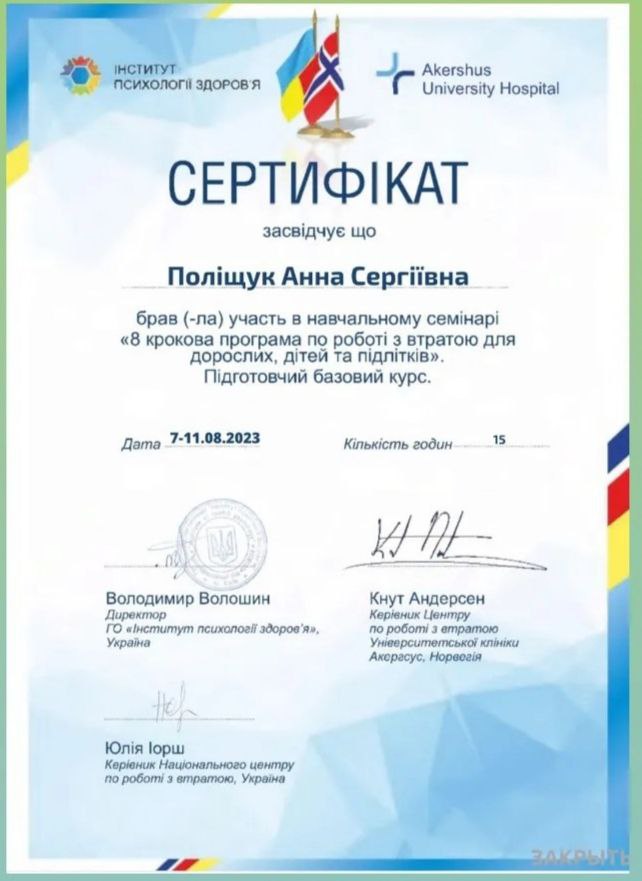 2023 — Інститут психології здоров’я. «8-крокова програма по роботі з втратою для дорослих, дітей та підлітків». Підготовчий базовий курс. 7-11.08.2023 р.