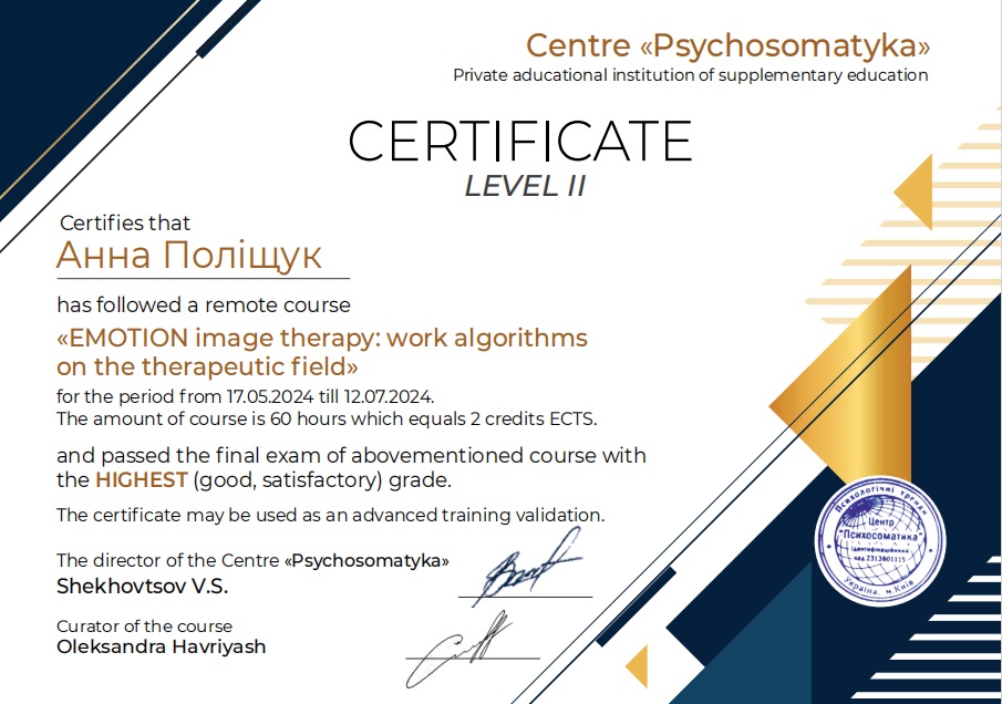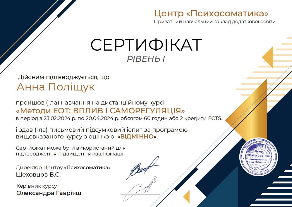 - Рівень 1 : «Методи емоційно-образної терапії:вплив і саморегуляція»-лютий-квітень 2024р.