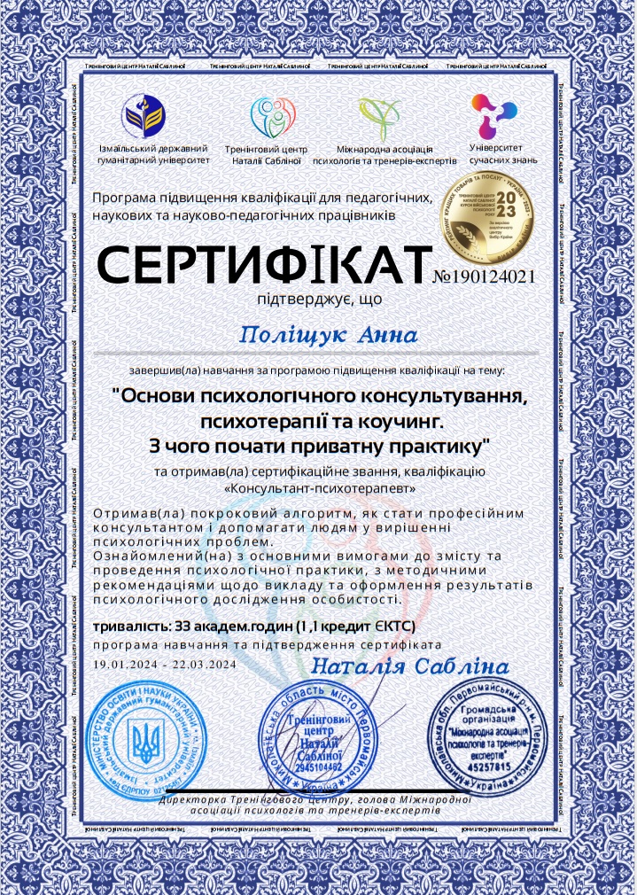 2024 — Ізмаїльський державний гуманітарний університет ,Тренінговий центр Наталії Сабліної, Міжнародна асоціація психологів та тренерів -експертів, Університет сучасних знань «Основи психологічного консультування, психотерапії та коучинг. З чого почати приватну практику»-січень-березень 2024р.