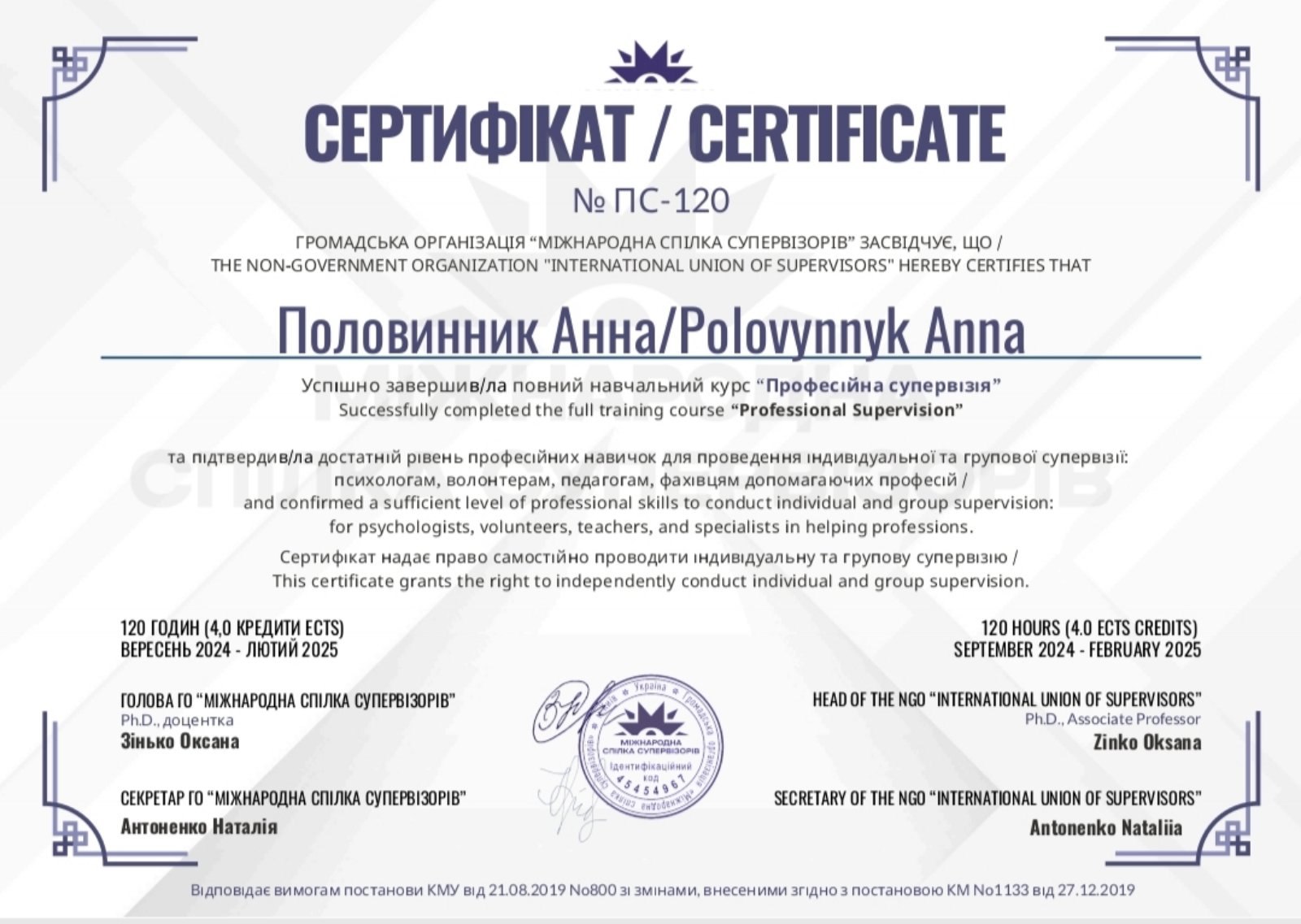вересень 2024 року – лютий 2025 – Міжнародна спілка супервізорів. Супервізорка у багатофокусному полімодальному підході.