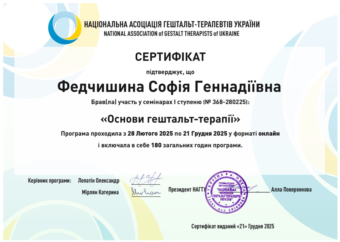 Я завершила магістратуру з психології та навчаюсь на 2 рівні гештальт-терапії на шляху до сертифікації психотерапевта. У своїй роботі поєдную професійні знання з особистим досвідом – понад 7 років у власній терапії, а також додаткові навчання, супервізії та сертифікації (коучинг, менторинг, діагностика, дитяча психологія, робота з метафоричними картами).