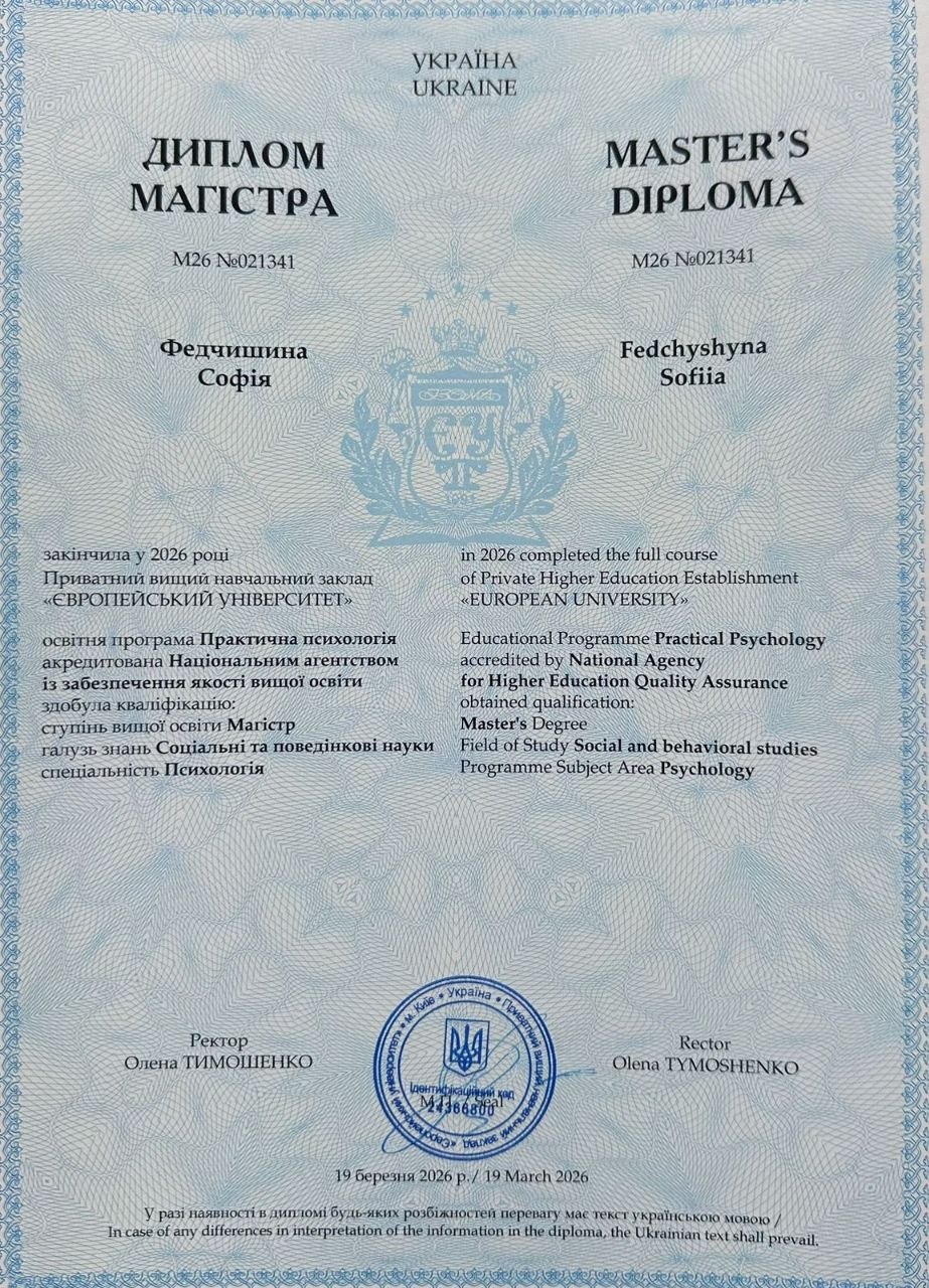 2026 — Магістр психології, освітня програма «Практична психологія», ПВНЗ «Європейський університет»