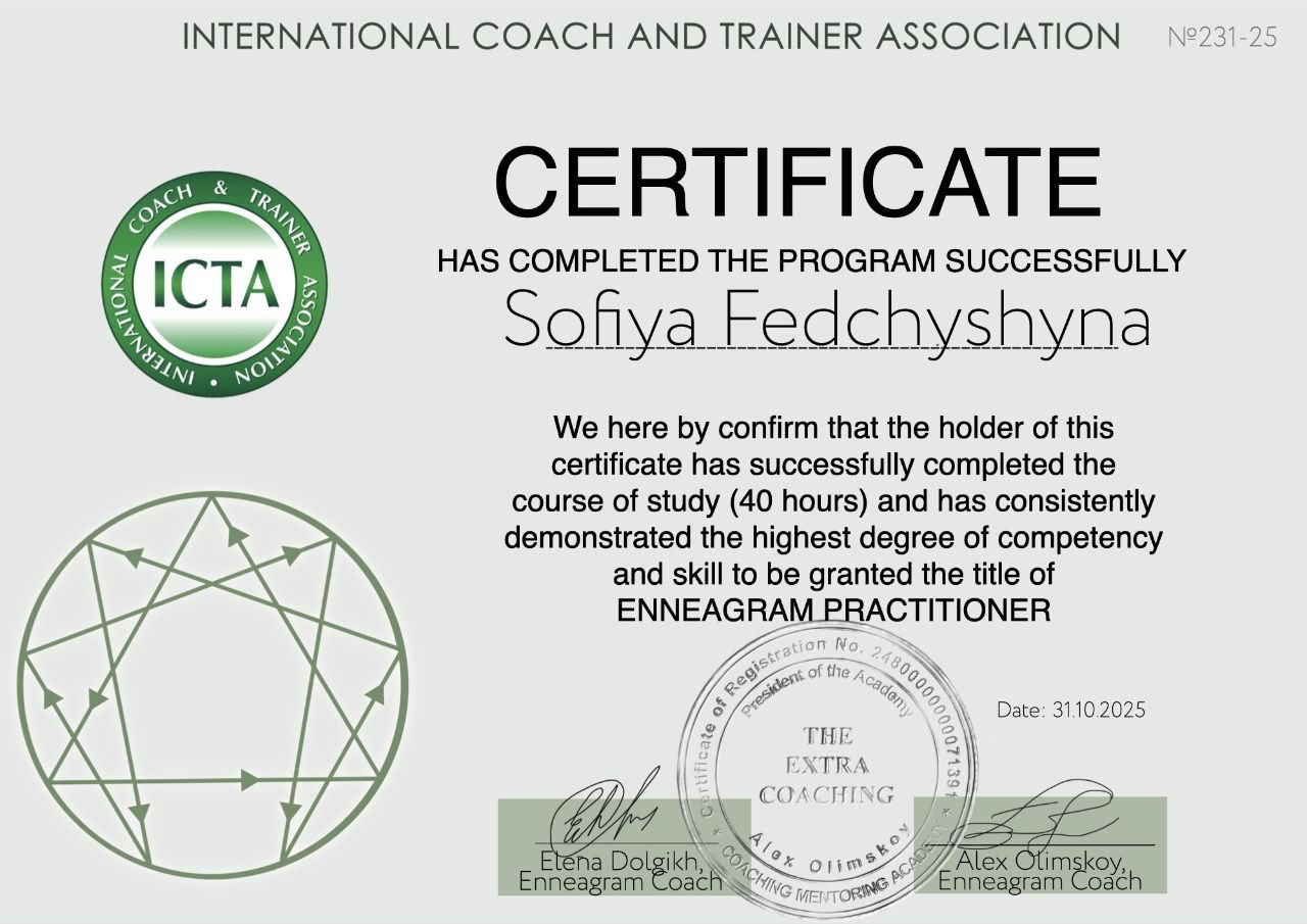 2025 — «Enneagram Practitioner», International Coach and Trainer Association (ICTA)