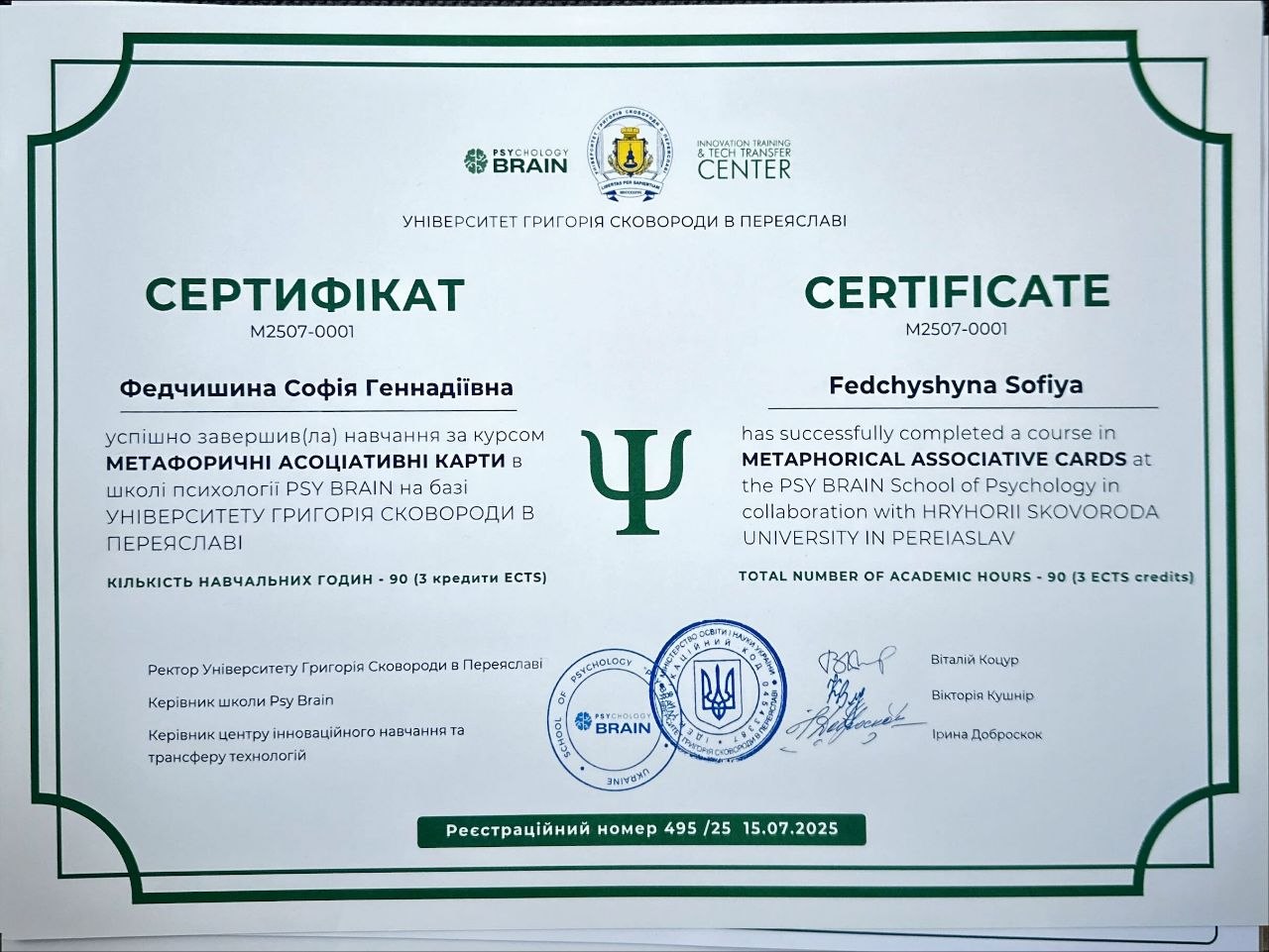 2025 — «Метафоричні асоціативні карти», Школа психології PSY BRAIN, Університет Григорія Сковороди в Переяславі