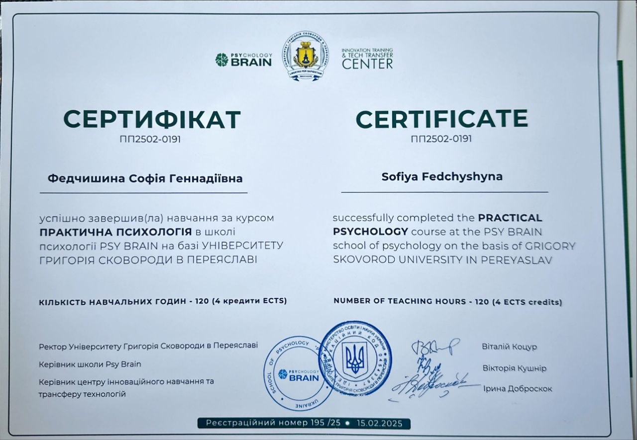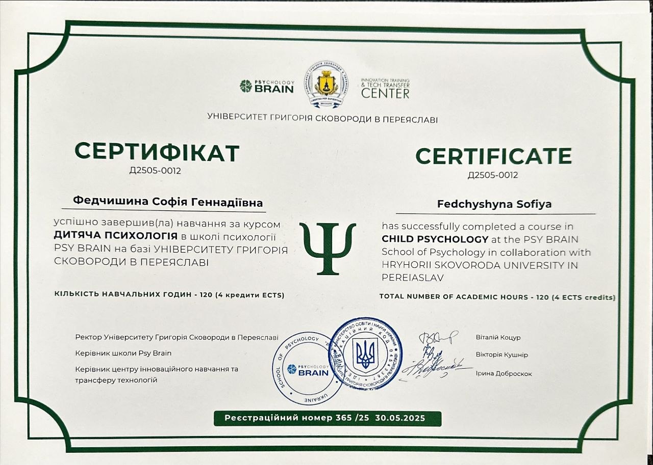 2025 — «Дитяча психологія, Школа психології PSY BRAIN», Університет Григорія Сковороди в Переяславі
