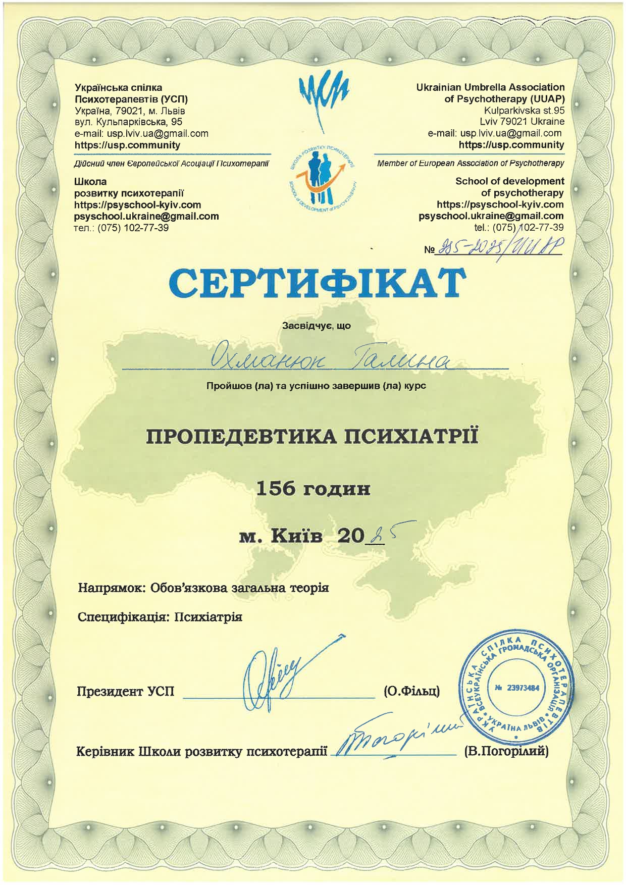 2025 — «Пропедевтика психіатрії, Школа розвитку психотерапії», Українська спілка психотерапевтів