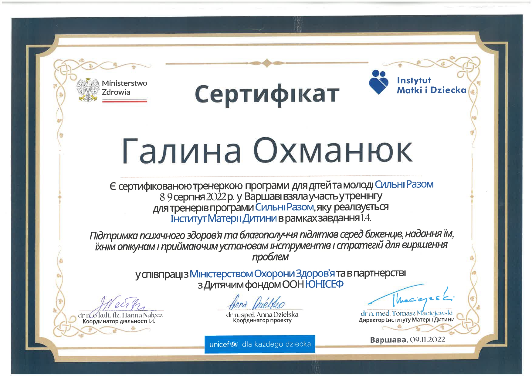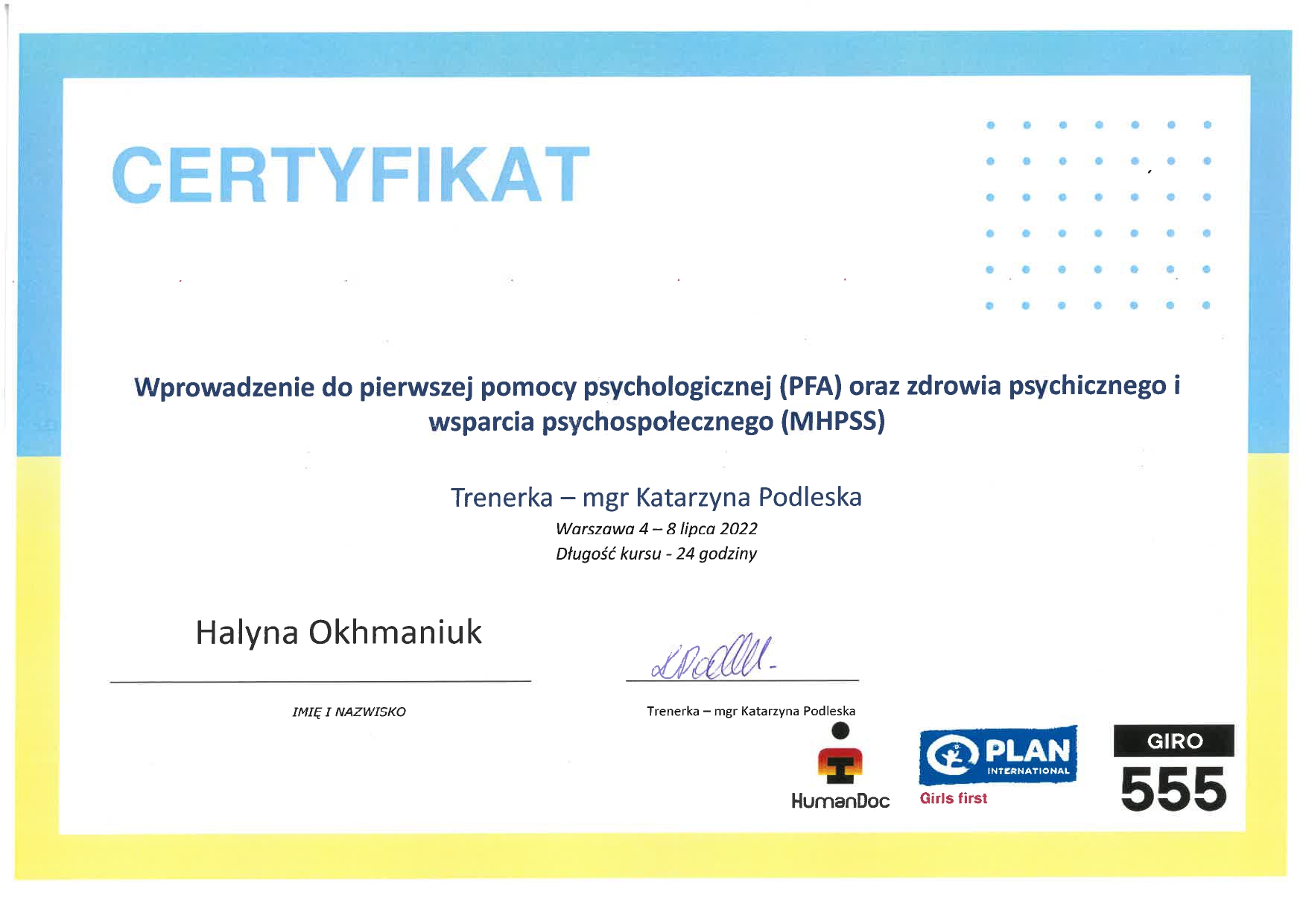 2022 — «Введення до першої психологічної допомоги (PFA) та підтримки психічного здоров’я (MHPSS)», mgr Katarzyna Podleska