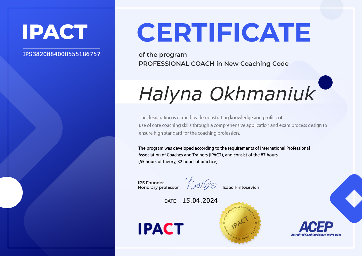 2024 — «Професійний коуч (Professional Coach in New Coaching)», IPACT (International Professional Association of Coaches and Trainers)