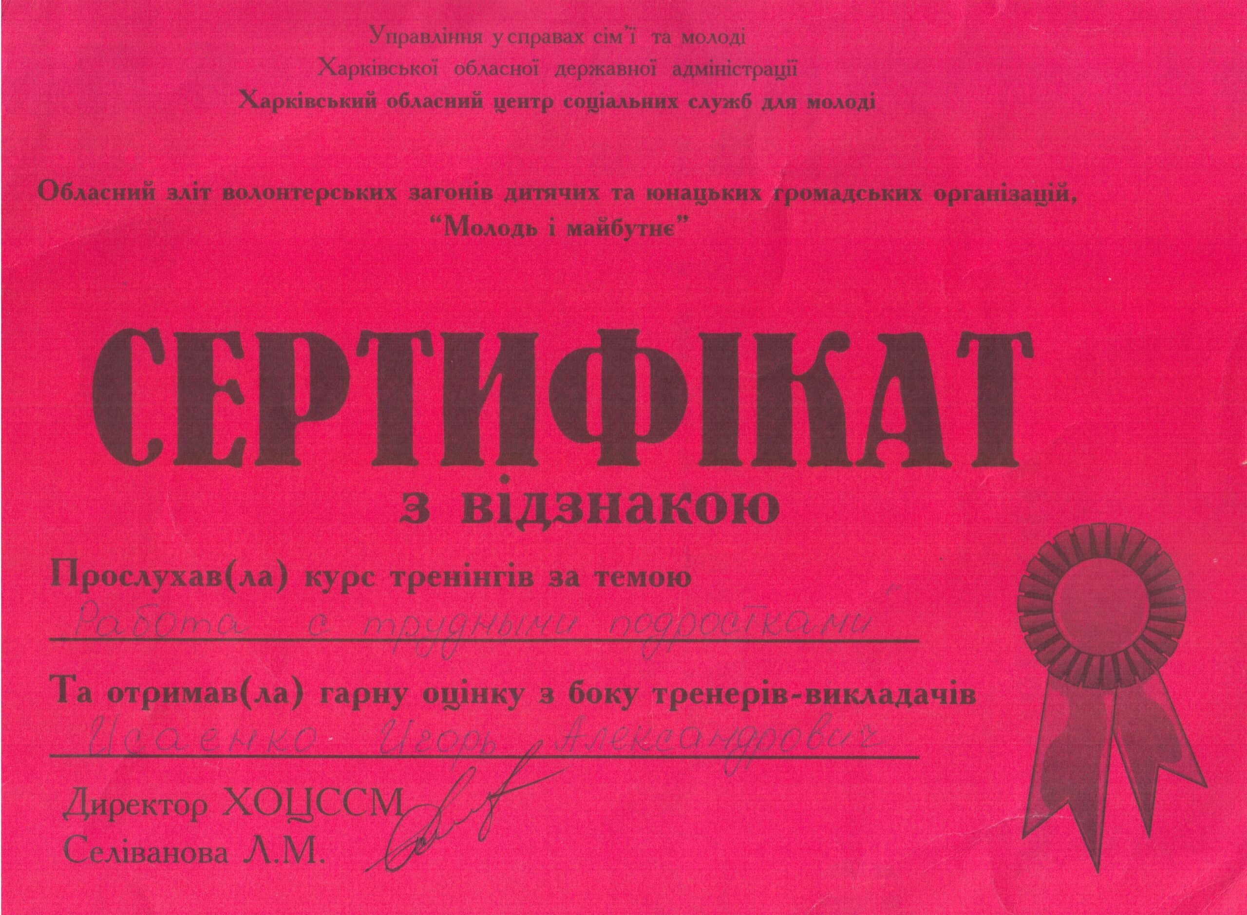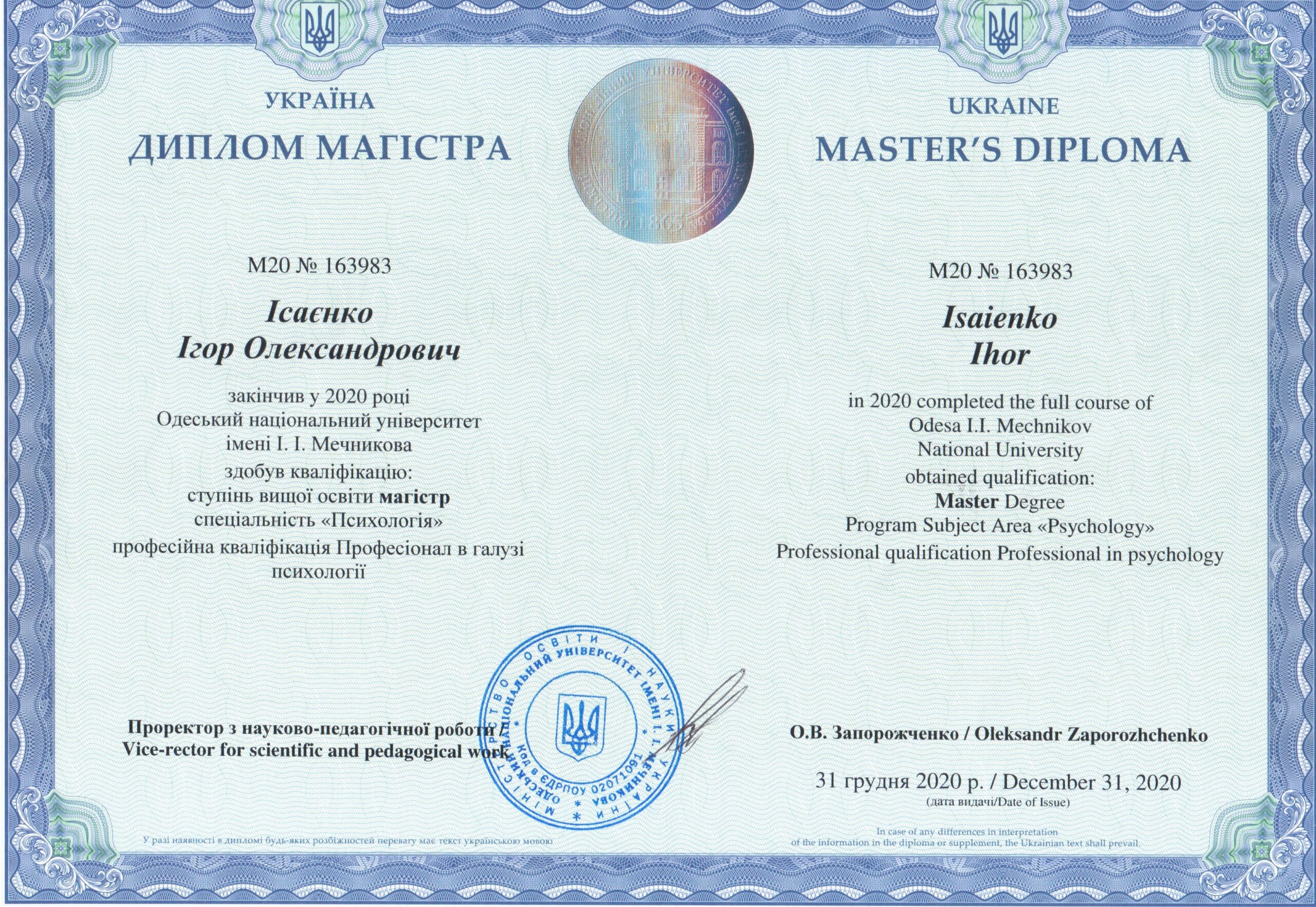 — Магістратура Одеського національного університету імені Мечникова – спеціальність – психолог-викладач
