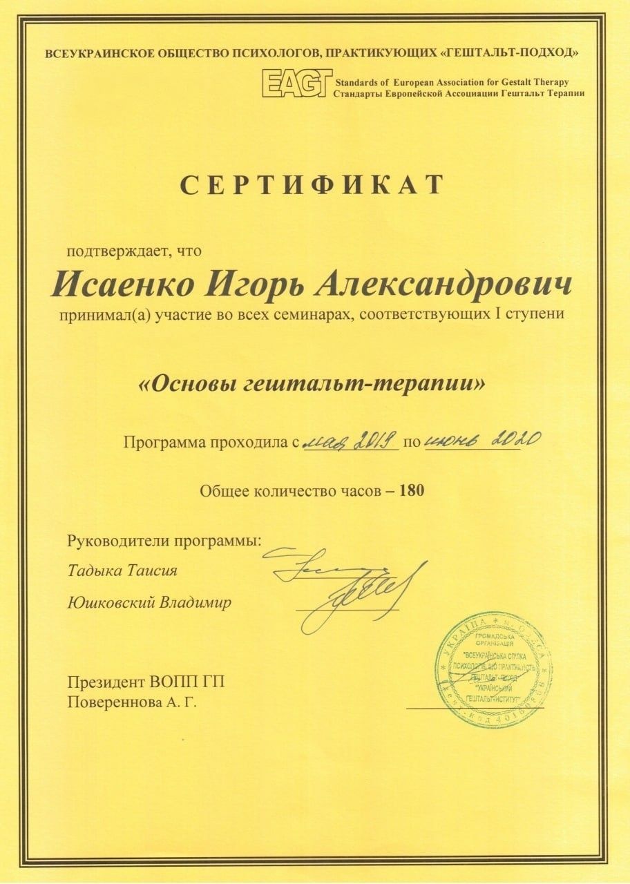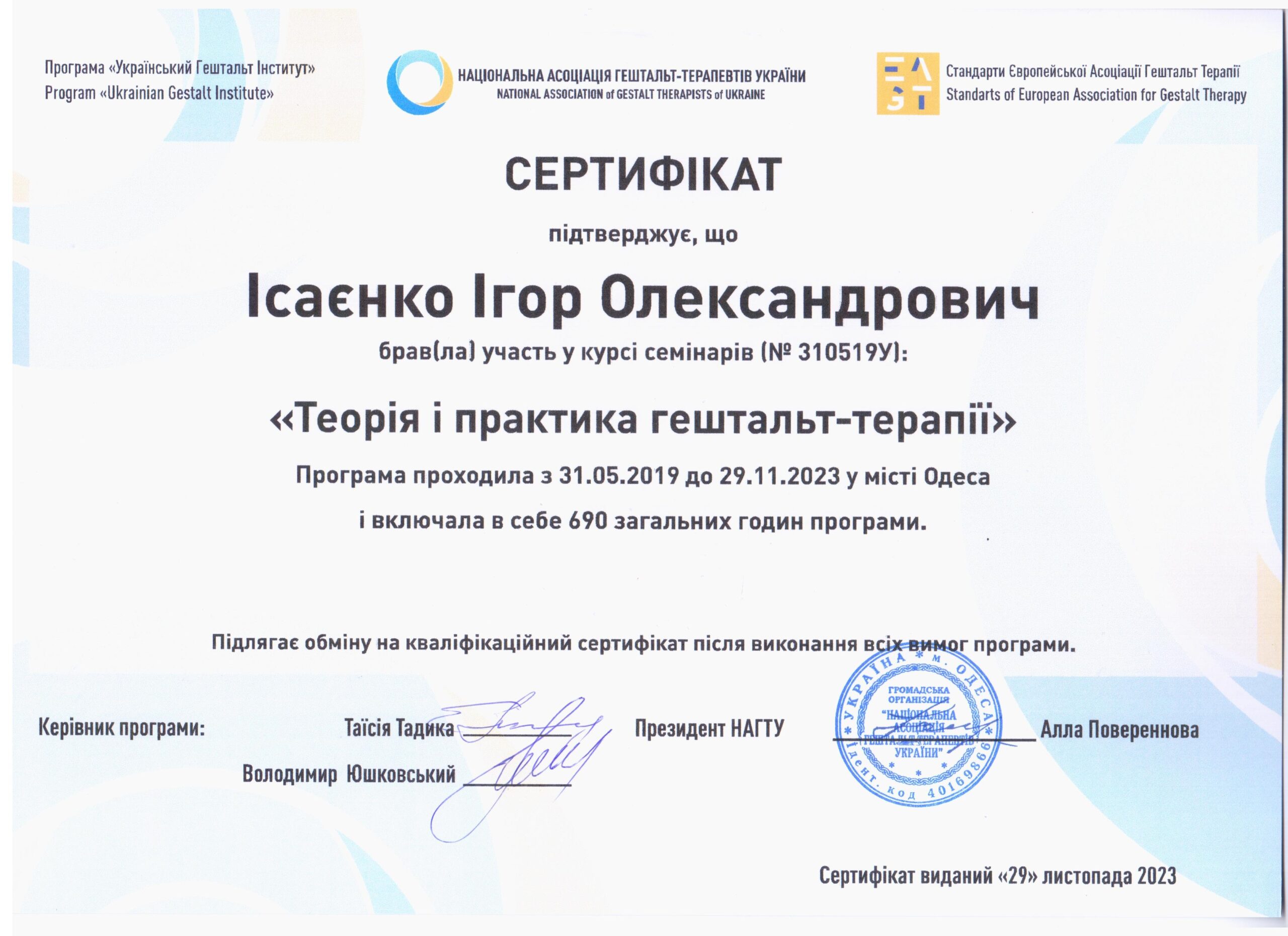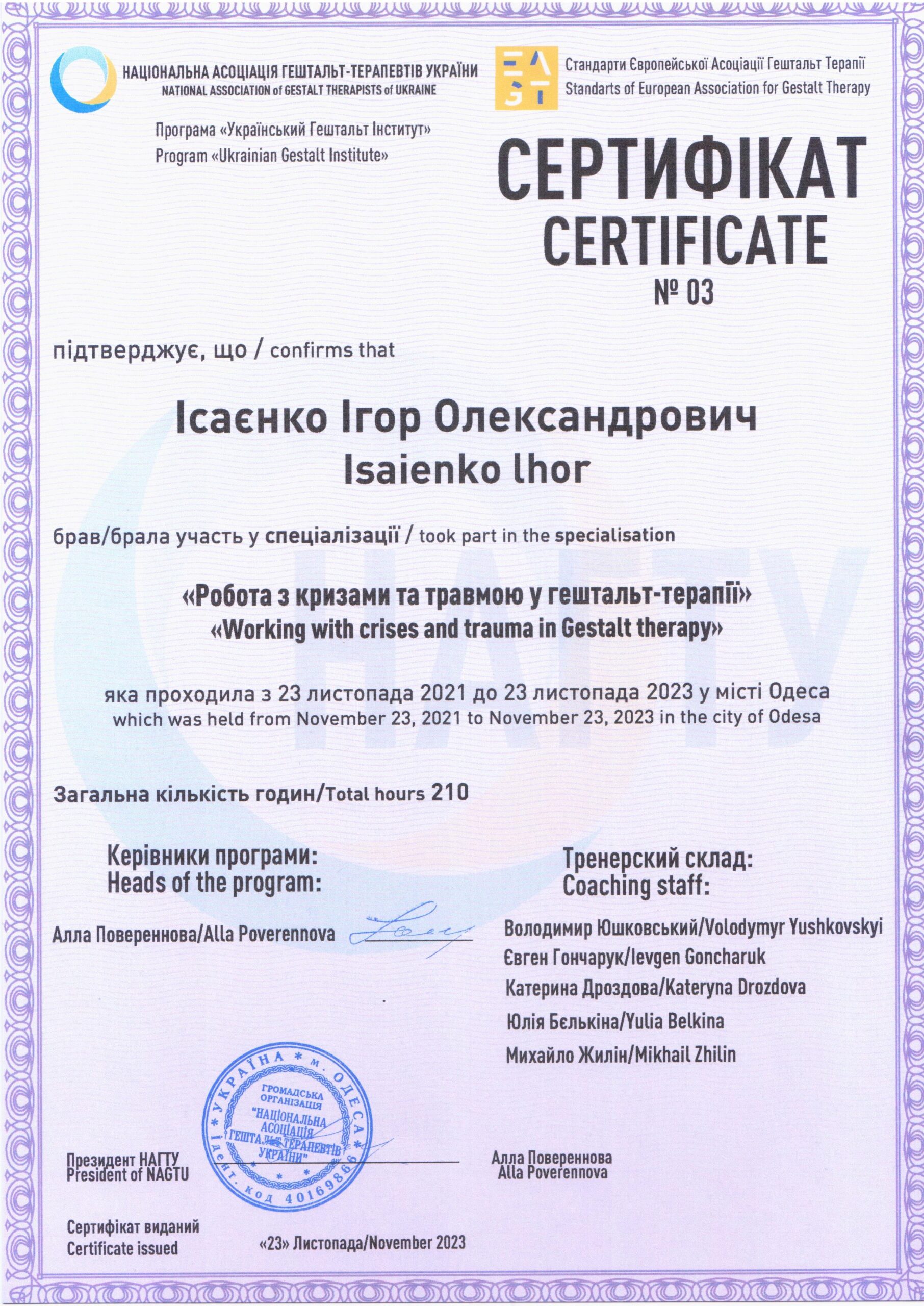 2023 — НАДТУ «Український гештальт-інститут» – гештальт-терапевт – спеціалізація – кризи та травми