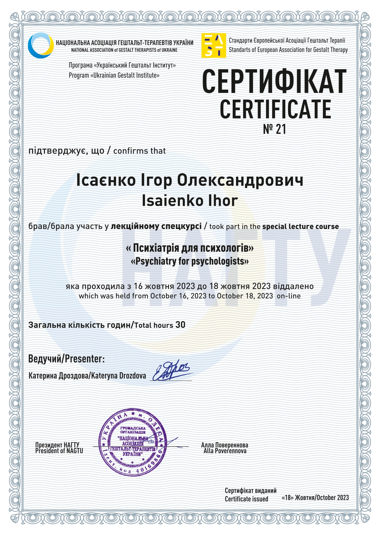 2023 — Психіатрія для психологів (30 годин), Український гештальт-інститут
