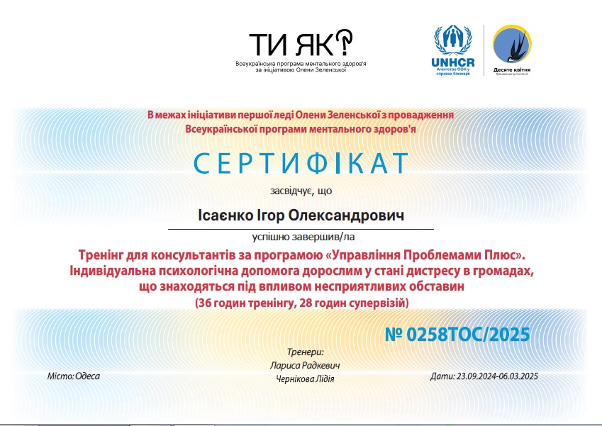 2025 — Тренінг для консультантів за програмою «Управління Проблемами Плюс». Індивідуальна психологічна допомога дорослим у стані дистресу в громадах, що знаходяться під впливом несприятливих обставин