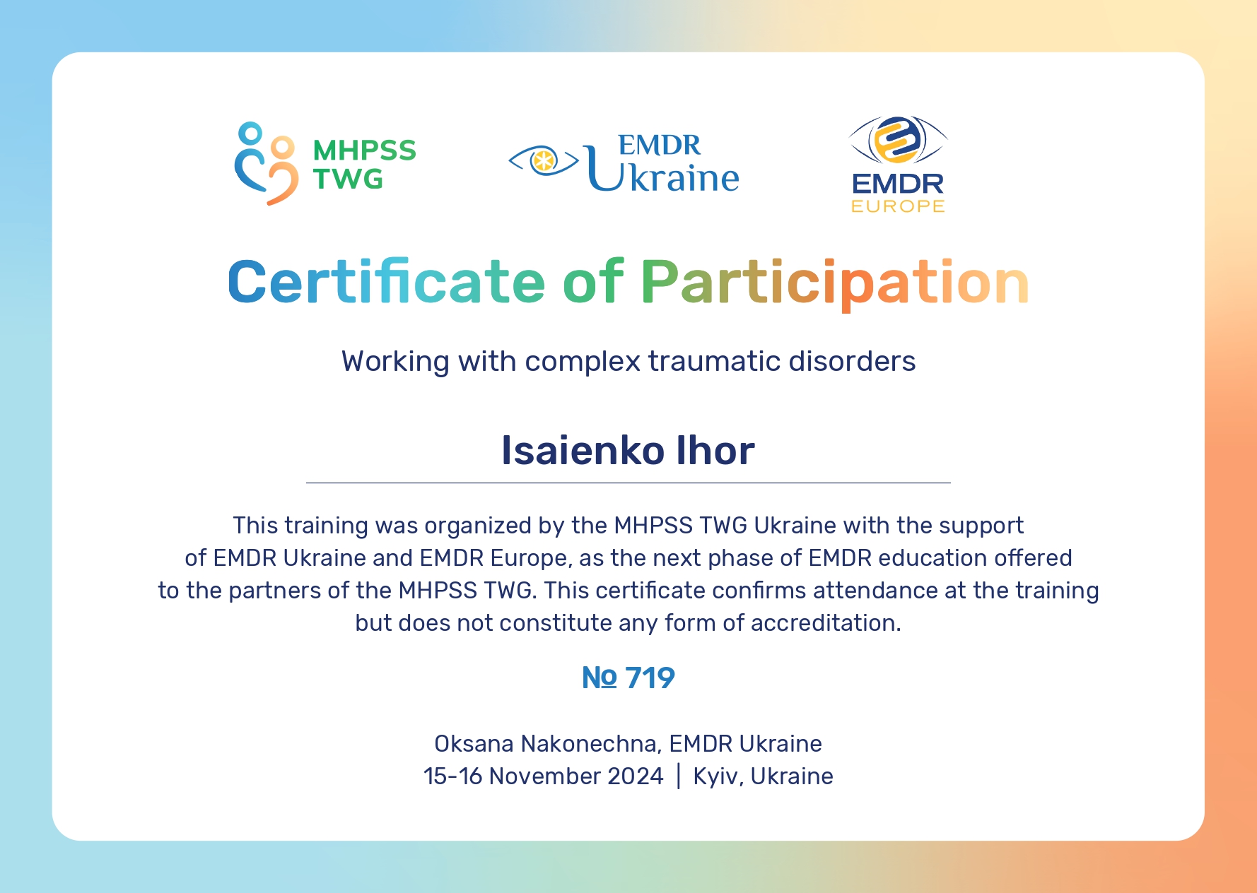 2024 — Working with complex traumatic disorders (робота з комплексними травматичними розладами), EMDR Україна / EMDR Europe