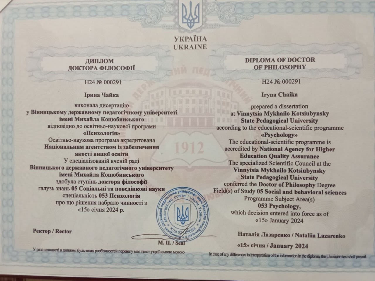 Науковий ступінь: доктор філософії зі спеціальності 053 «Психологія» (кандидат психологічних наук)