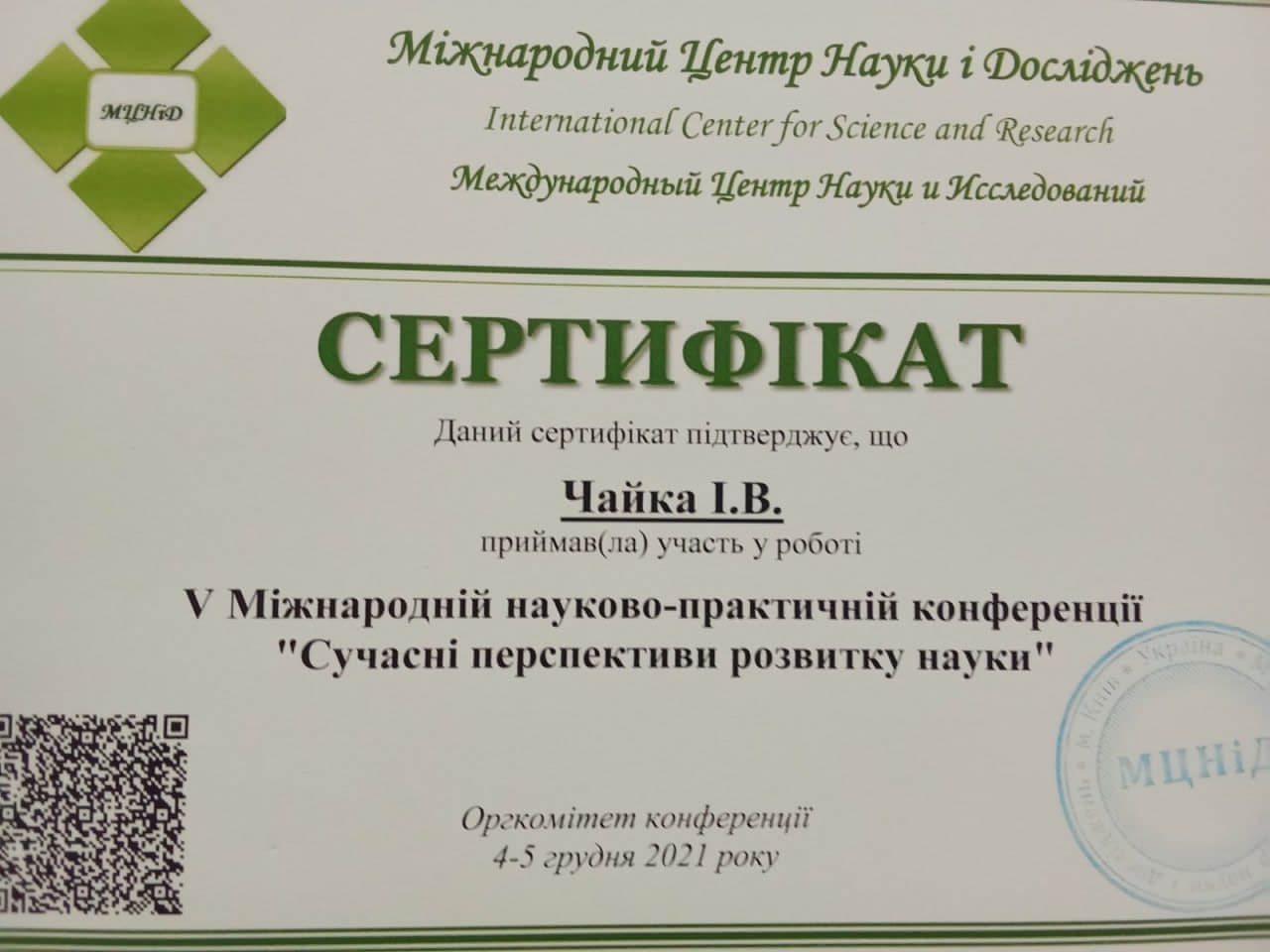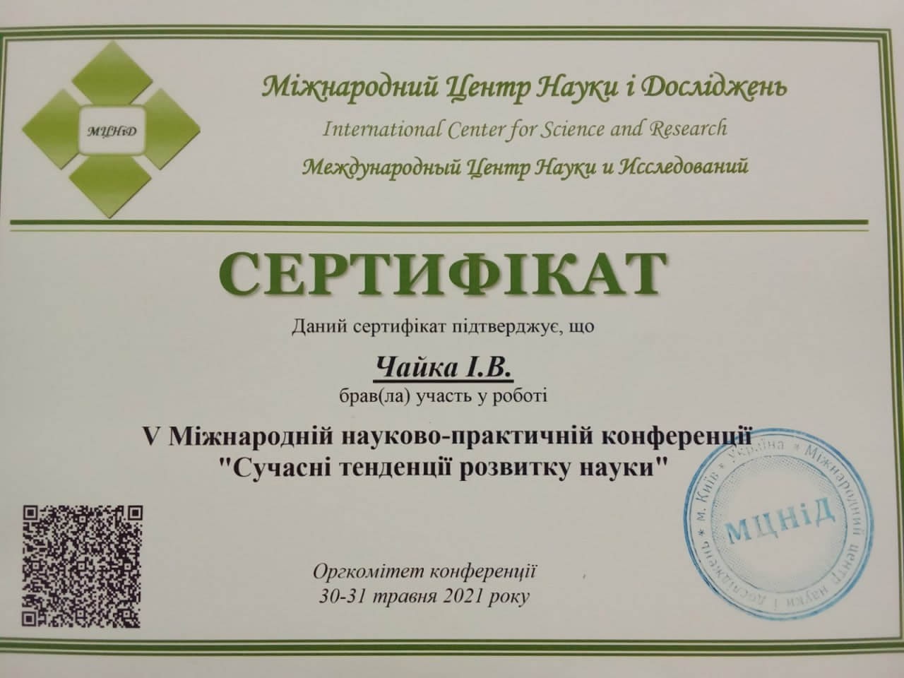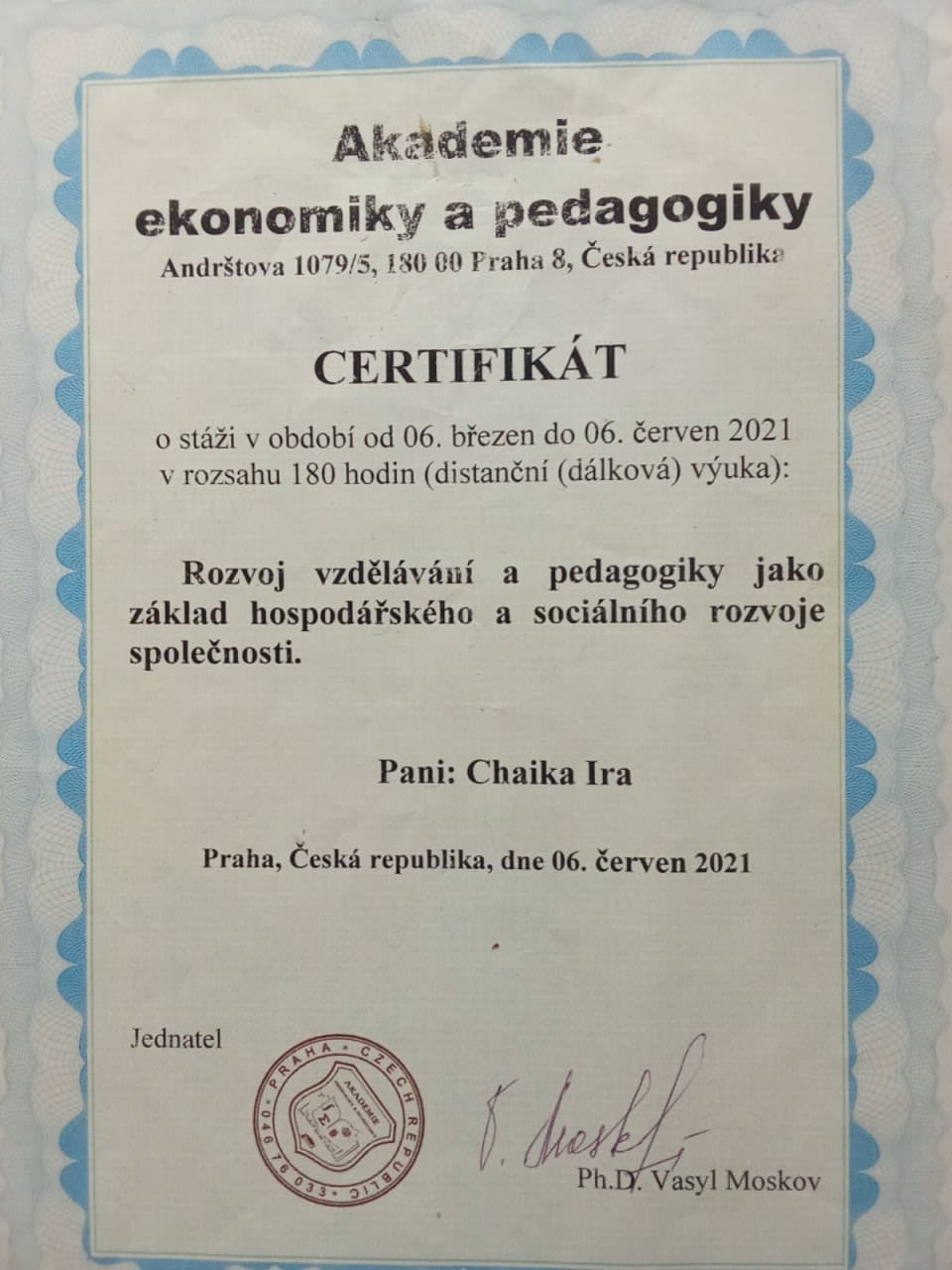 - Березень-червень 2021 р. – закордонне науково-педагогічне стажування (Академія економіки та педагогіки. Прага, Чеська республіка, 180 год.)