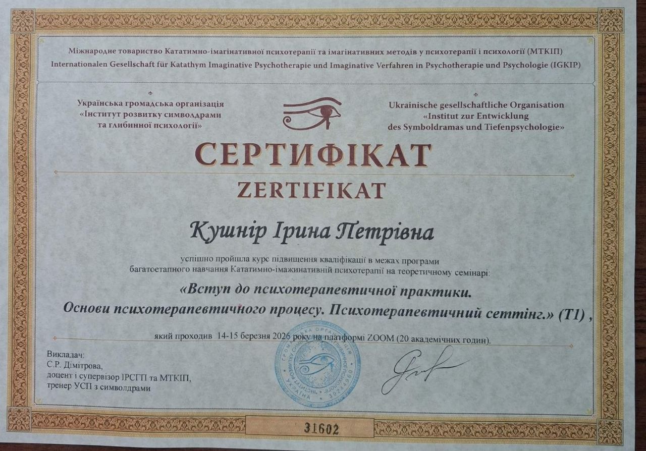 2026 — «Вступ до психотерапевтичної практики. Основи психотерапевтичного процесу. Психотерапевтичний сеттинг (Т1)»,  Інститут розвитку символдрами та глибинної психології