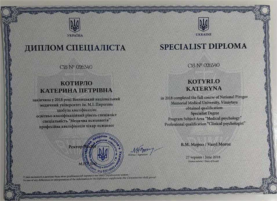 2018 — Спеціаліст з медичної психології (кваліфікація «Медичний психолог», спеціальність «Медична психологія»), Вінницький національний медичний університет ім. М.І. Пирогова