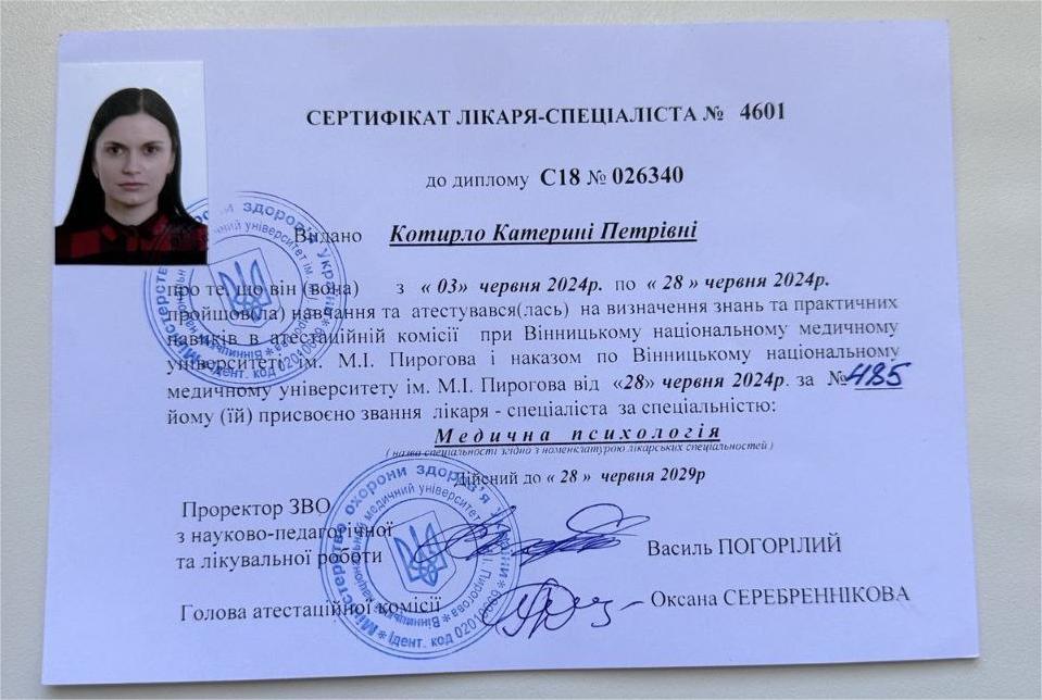 2024 — Спеціалізація «Медична психологія» (лікар-спеціаліст з медичної психології) Сертифікат лікаря-спеціаліста № 4601 від 28 червня 2024 р. Дійсний до 28 червня 2029 р. Атестація проведена на базі Вінницького національного медичного університету ім. М.І. Пирогова