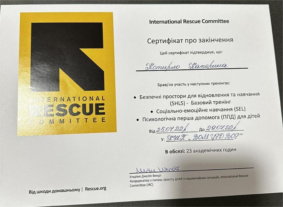 2022 — Тренінги «Безпечні простори для відновлення та навчання (SHLS)», «Соціально-емоційне навчання (SEL)», «Психологічна перша допомога (ППД) для дітей», International Rescue Committee, координатор: Ульріке Джулія Вендт